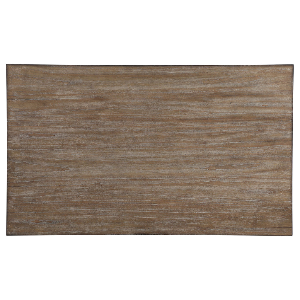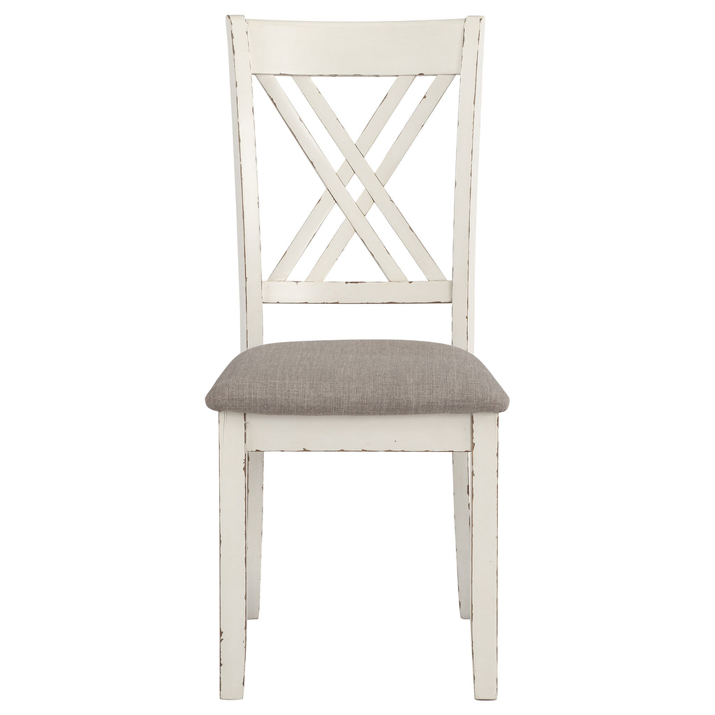 Complete your modern farmhouse dining room with this seven-piece dining set. Complete with one dining table and six side chairs, it offers a matching vintage white finish that lends a country charm. The spacious, rectangular dining table also features a chestnut colored, sandblasted wood tabletop with a dry brushed weathered finish. Each of the six chairs have a sturdy solid wood frame and flared backrests with open double-cross designs. Rest comfortably on their cushioned seats, wrapped in a high performance fabric in a grey hue that complements numerous color palettes. Key Features: • A seven piece set that will sell day in and day out with its charming worn finish and modern translation of farm house • Sold as a seven piece set all packed in one carton • With a sand blasted table top, dry brushed, sand thru effects • Chairs are solid rubberwood, with seat frame construction • Seats are upholstered with light brown color high performance fabric