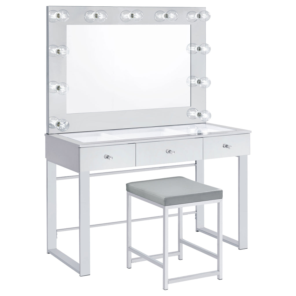 Rest comfortably in this chic contemporary vanity stool as you apply makeup or prepare for the day. Featuring a square shape design and a densely padded, foam-filled cushion , this modern stool provides a spacious for long-lasting comfort. The seat cushion is also wrapped entirely in a smooth grey tone leatherette. With a backless design, you can slide it beneath a vanity table when not in use. The base offers all the support you need with a heavy gauge steel frame with a gleaming electroplated, polished chrome finish. Key Features: • This backless stool is a testament to contemporary design • Full foam padded seat cushion upholstered in a durable leatherette • Heavy gauge steel frame electroplated and polished in chrome • Constructed with steel, MDF, foam, and leatherette • Available in dark grey and light grey to match with any palette