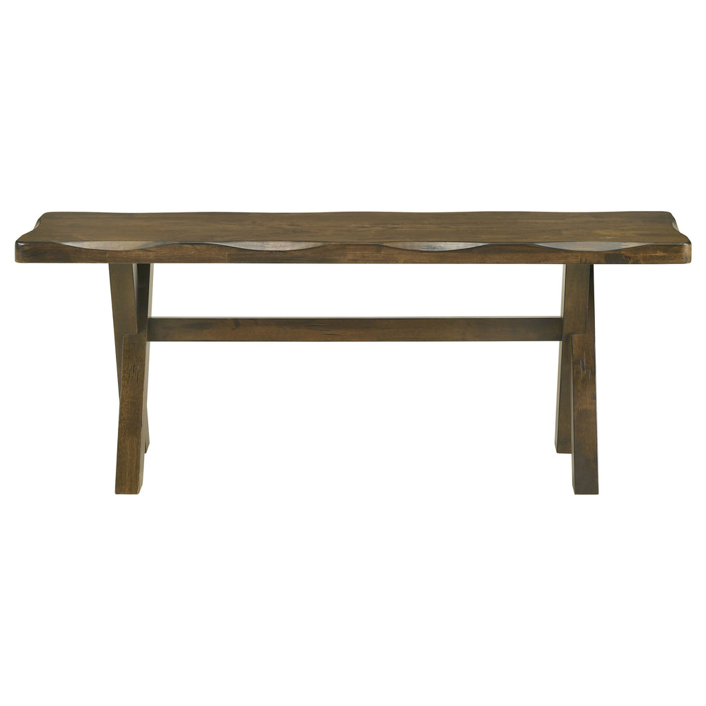 Crafted from solid rubberwood, this dining bench embodies rustic charm with its knotty nutmeg finish and worn edges that highlight the natural beauty of wood. The sturdy trestle-style base provides reliable support, while the smooth, contoured seat offers a comfortable place to gather. Designed for versatility, this bench slides neatly under the table when not in use, making it perfect for both spacious and compact dining areas. A timeless addition to any farmhouse, rustic, or traditional space. Key Features: • Dining bench crafted from solid rubberwood for lasting durability • Knotty nutmeg finish highlights natural wood grain and rustic charm • Smooth contoured seat with worn edges for a handcrafted look • Sturdy trestle base enhances stability and timeless farmhouse appeal • Compact design allows for easy storage under a dining table when not in use • Ideal for rustic, farmhouse, and traditional dining room settings
