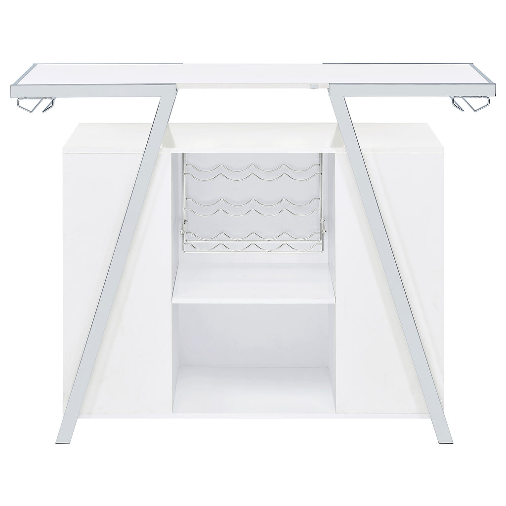 Pull out all the stops to breathe fresh energy and organization into a casual space dedicated to entertainment. Your needs are met with this modular-inspired and contemporary home bar constructed of MDF, paper coating, and veneer, all with a bright white finish. Metal framing is jazzy with a geometric motif, supporting a spacious top shelf ideal for beverage and snack prep. A center compartment features shelving and bottle racks, while the integrated LED strip located on the underside of the table top can change color. This handy bar unit transforms a compact space into a modern home-based venue for fun. Key Features: • Modular-inspired and contemporary home bar constructed of MDF, paper coating, and veneer with bright white finish and metal framing with geometric motif • Spacious top shelf ideal for beverage and snack prep, center compartment with shelving and bottle racks • Integrated LED strip located on underside of table top changes color • Transforms compact space into modern home-based venue for fun • Pulls out all the stops to breathe fresh energy and organization into casual entertainment space