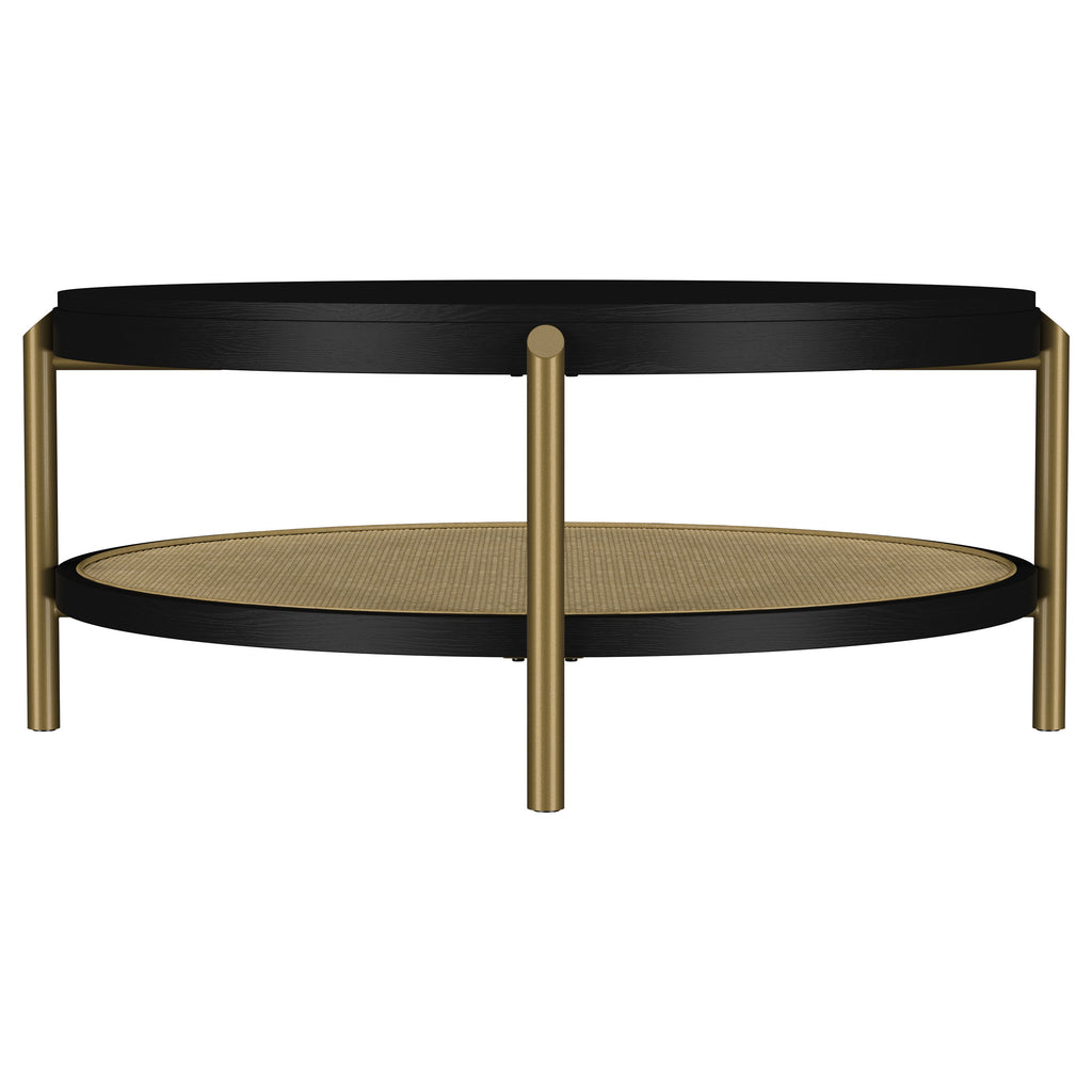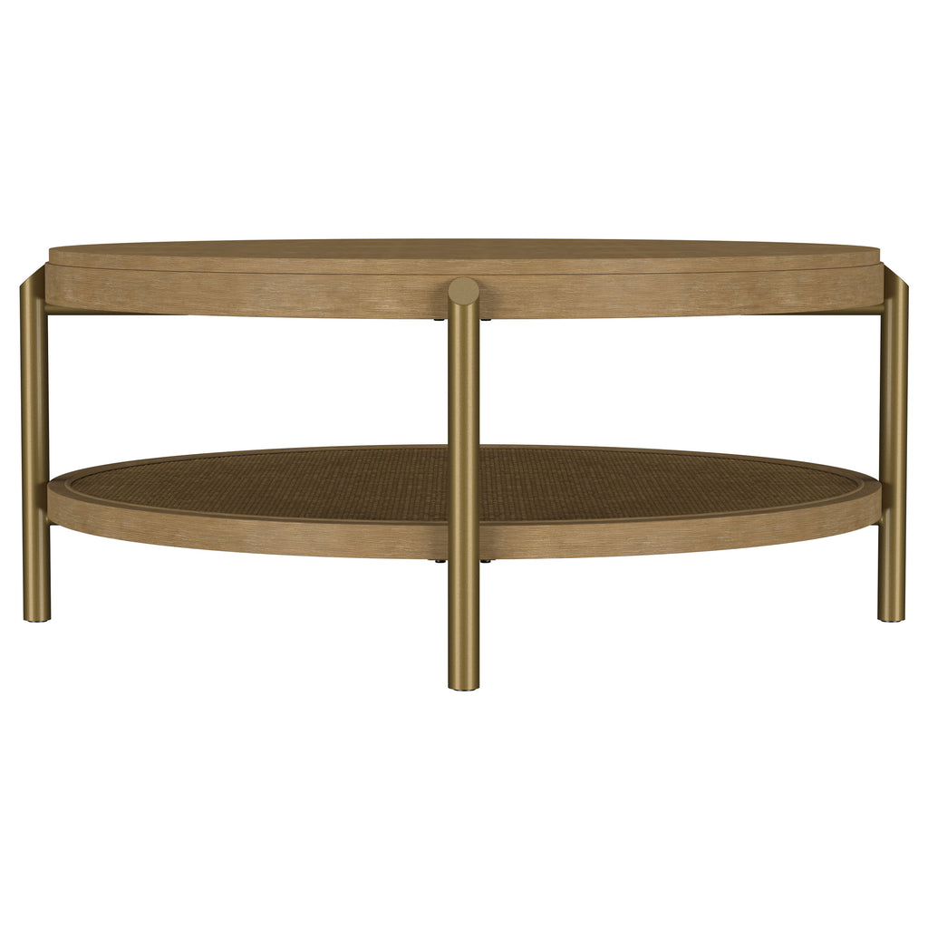 This round coffee table combines modern design with rustic charm, perfect for today’s living spaces. Crafted with rubberwood, engineered wood, and ash veneer, its smooth finish highlights the natural wood grain for an organic appeal. The lower shelf features woven rattan, offering practical storage and a textured look. Supported by aged brass-finished metal legs, this cocktail table delivers a balance of durability and style, serving as a functional centerpiece for any living room or lounge area. Key Features: • Round coffee table with subtle, rustic sand wash finish • Crafted from rubberwood, engineered wood, and ash veneer • Lower shelf made from natural woven rattan for storage • Aged brass-finished metal legs ensure stability and style • Functional dual-tier design for display or organization • Stylish and practical centerpiece for living rooms or lounge spaces