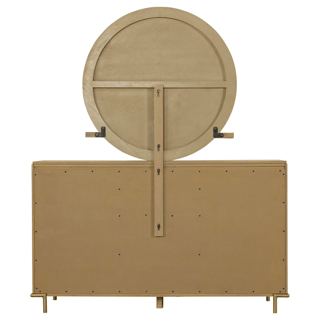 This mid-century modern dresser and mirror set blends elegant design with versatile functionality. The eight-drawer dresser features a wire-brushed sand wash finish, aged brass knobs, and slender metal legs for a refined touch. Felt-lined top drawers offer safe storage for delicate items, while softly rounded corners add subtle sophistication. Above, the round mirror includes a felt-lined tray and can be mounted to the dresser or hung independently on the wall, offering flexible styling and practical beauty for any bedroom._x005F_x000D_ Key Features: • Eight-drawer dresser in sand wash wire-brushed finish for natural texture • Aged brass knobs and slim metal legs offer modern mid-century charm • Felt-lined top drawers protect jewelry and delicate accessories • Round mirror includes felt-lined tray for storage and display • Mirror mounts to matching dresser or hangs freely on the wall • Crafted from rubberwood, engineered wood, and ash veneer