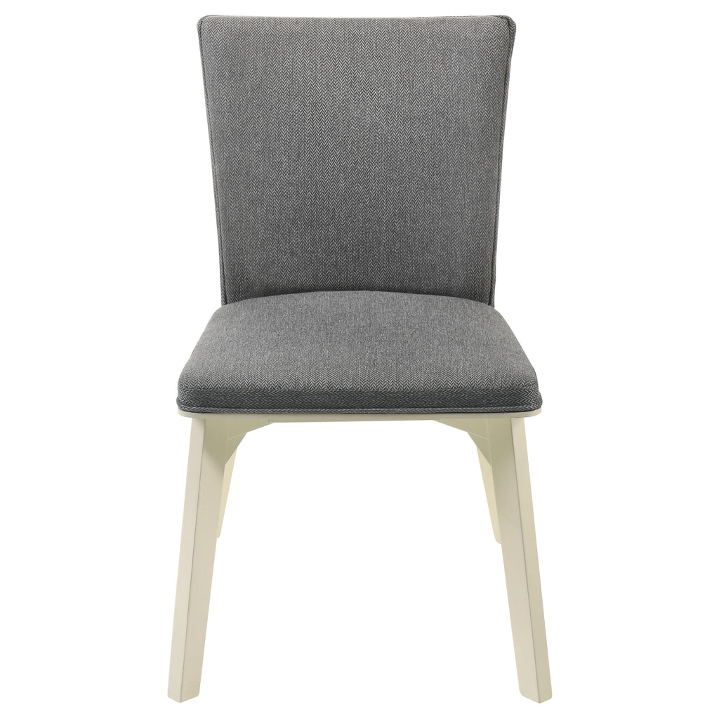 Enhance your dining area with the modern simplicity of this comfortable dining chair. The chair features soft gray fabric upholstery over plush cushioning for a comfortable seat. Its sleek, angular white base creates a subtle, airy contrast, while its streamlined design makes it a perfect match for contemporary spaces. Ideal for long meals or casual get-togethers, this chair adds both style and comfort to your dining set. Key Features: • Modern dining chair with grey fabric upholstery for a soft, comfortable seat • Plush cushioning creates a cozy dining experience • Clean, angular white base provides stylish contrast • Sleek design perfect for modern dining spaces • Ideal for pairing with a variety of dining tables or sets
