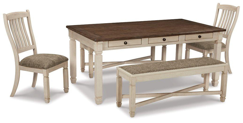 Enjoy beautiful cottage style with this classic dining table set. With a rustic planked top, this table serves up casual with a vintage twist. The gently distressed tabletop, paired with the rake-back design of the chairs in a textured antique white finish, is a perfect set for impromptu gatherings. With six built-in drawers, you can keep placemats, napkins and utensils on hand for maximum practicality in any living space. For a quaint ensemble you're bound to love, choose this set.