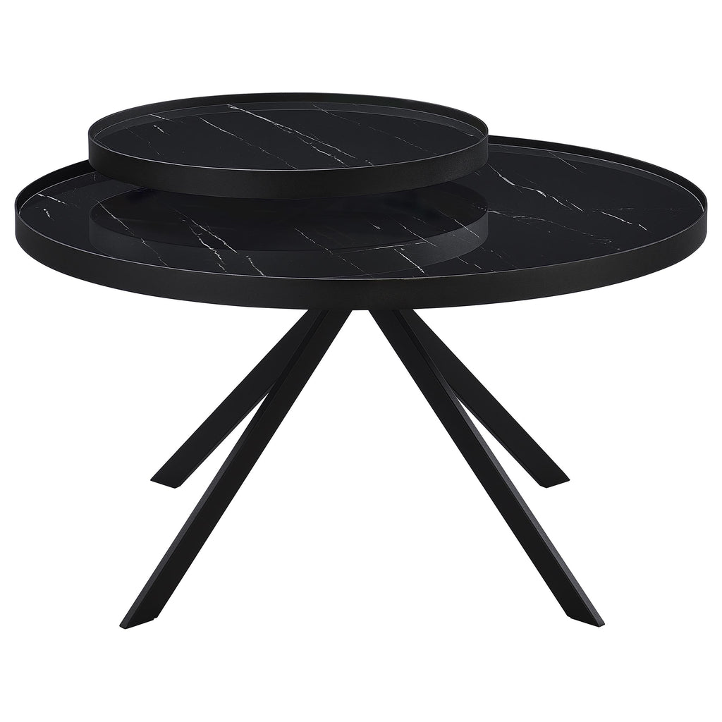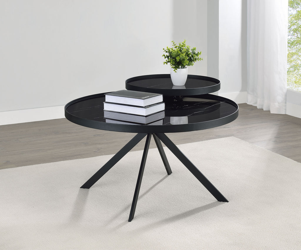 This modern two-tier coffee table features a sleek metal frame and tempered glass tops with marble-pattern printing for a refined aesthetic. Its multi-level design offers added functionality, perfect for displaying decor or organizing essentials. The sturdy metal construction ensures durability, while the smooth surfaces create a clean, contemporary look that enhances any living space with style and practicality. Key Features: • Two-tier coffee table with tempered glass tops • Stylish marble-pattern print enhances visual appeal • Sturdy white metal frame ensures lasting stability • Multi-level surface with smaller swivel table ideal for storage or display needs • Tempered glass surface is durable and easy to clean • Ideal centerpiece for modern living rooms