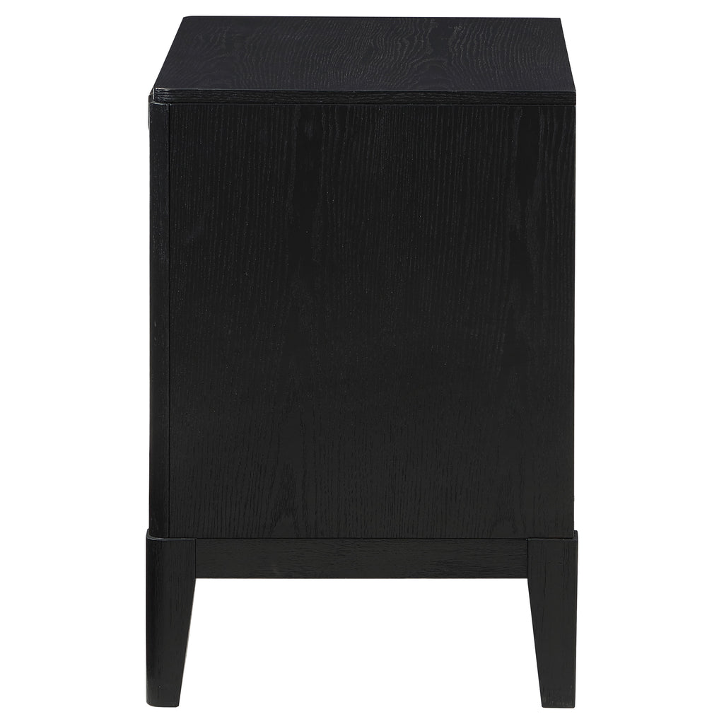 Augment your sophisticated bedroom with the addition of a modern two-drawer nightstand. It boasts a classic stance, with two drawers that offer a place for overnight essentials and personal necessities like books. The top drawer includes felt lining while half-moon pulls add metallic contrast with a soft golden hue. Drawer fronts are fluted, offering impressive texture and dimensionality at your bedside. Its black finish is wire brushed, adding the perfect touch of texture and depth. Key Features: • Stylish and modern, a contemporary wood nightstand features a wire brushed black finish • Fluted texturing highlights two drawer fronts to provide sophisticated dimensionality • Drawers feature demi-lune metal handles in a warm golden tone for sophisticated contrast • Top drawer includes felt lining in matching black, offering easy protection to delicate items • Tapering legs complete the look while offering stability and support • Drawers feature English dovetail joinery for excellent craftsmanship