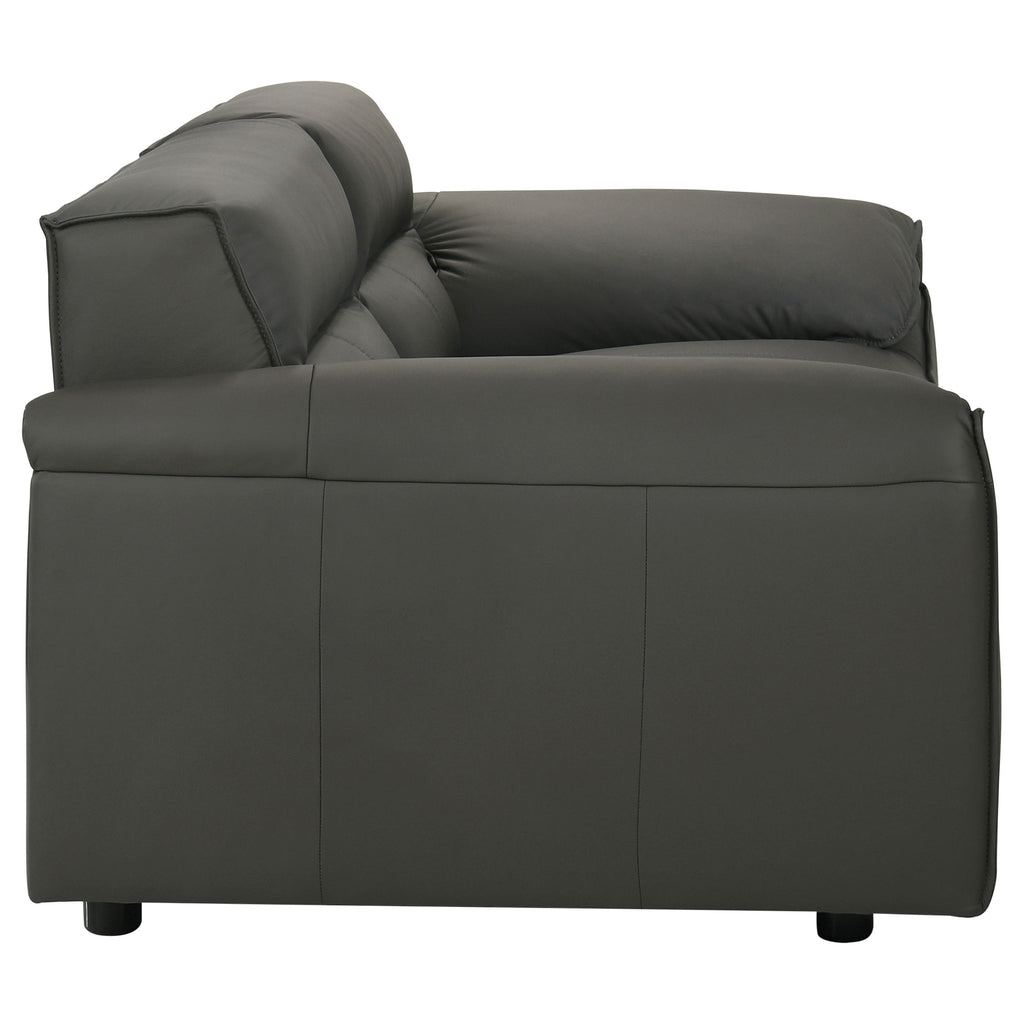 Refined and sculptural, this leather sofa set blends modern minimalism with deep, enveloping comfort. Upholstered in 100% genuine top grain leather, each piece features wide, gently sloped arms and a low-profile frame that grounds the room with effortless presence. Deep seat cushions are filled with high-density full foam and supported by sinuous springs, creating a balanced feel that’s both structured and soft. Tailored yet inviting, this two-piece set is crafted to elevate comfort with enduring sophistication. Key Features: • Two-piece sofa set includes a full-size sofa and loveseat with sculpted low-profile silhouettes • Upholstered in 100% top grain leather for breathable softness and lasting luxury • Wide, gently sloped arms offer relaxed comfort with a modern architectural edge • High-density full foam cushions provide deep, plush seating with durable structure • Sinuous spring seat foundation ensures consistent support and responsive comfort • Orange leather finish adds bold contrast and timeless character to any space