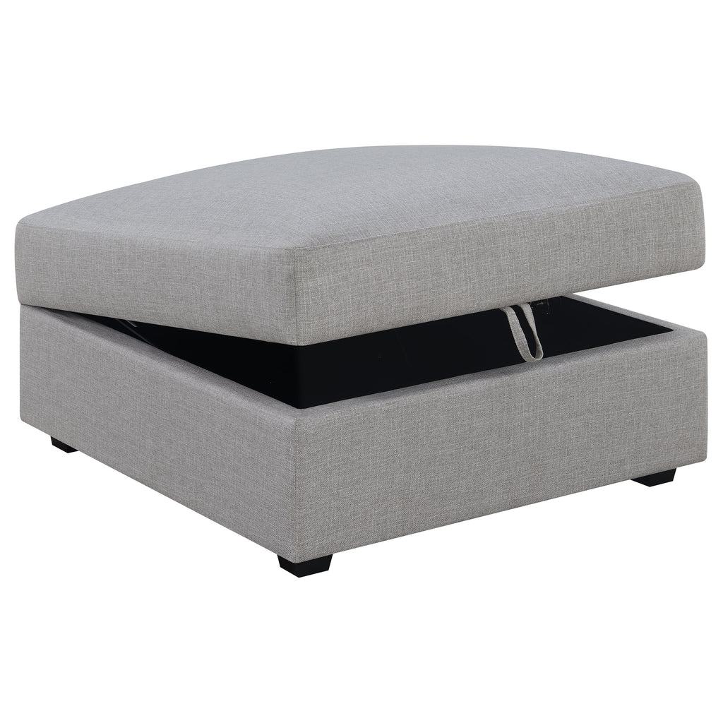 This storage ottoman combines sleek modern design with functional versatility for the living room. Upholstered in soft grey fabric, it features clean lines and a spacious hidden compartment for storing blankets, pillows, or daily essentials. Designed to pair seamlessly with modular sectional components or stand alone as a plush footrest, it offers exceptional flexibility. Feather-down wrapped cushioning and solid wood legs provide lasting comfort and support, blending practicality with refined contemporary style. Key Features: • Modern storage ottoman in soft grey fabric combines sleek form with everyday function • Hidden compartment offers space for blankets, pillows, or daily living essentials • Plush feather-down wrapped cushioning provides comfort and inviting softness • Clean silhouette complements both modular sectionals and standalone arrangements • Crafted with solid wood legs and a reinforced frame for durable long-term use • Versatile as a footrest, extra seat, or modular extension within a living room setup