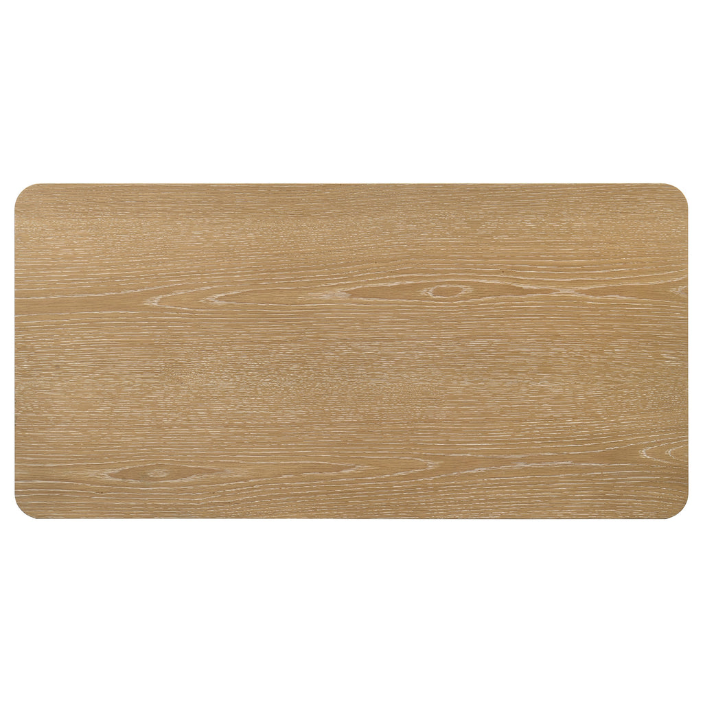 Balancing warmth with structure, this coffee table rests on cylindrical legs that anchor its linear profile. The softened corners and thick top deliver a subtle sculptural quality, while natural wood textures enhance its presence. Whether styled as a cocktail table or accent table, it invites relaxed connection and thoughtful display in the heart of the living room. Key Features: • Coffee table with rectangular top and round legs for a balanced modern profile • Brown oak finish emphasizes natural wood grain and tonal richness • Smooth corners and thick proportions create a grounded centerpiece • Crafted from solid rubberwood, engineered wood, and white oak veneer • Spacious surface supports books, trays, or decorative objects • Designed to coordinate with matching end table for full living room use