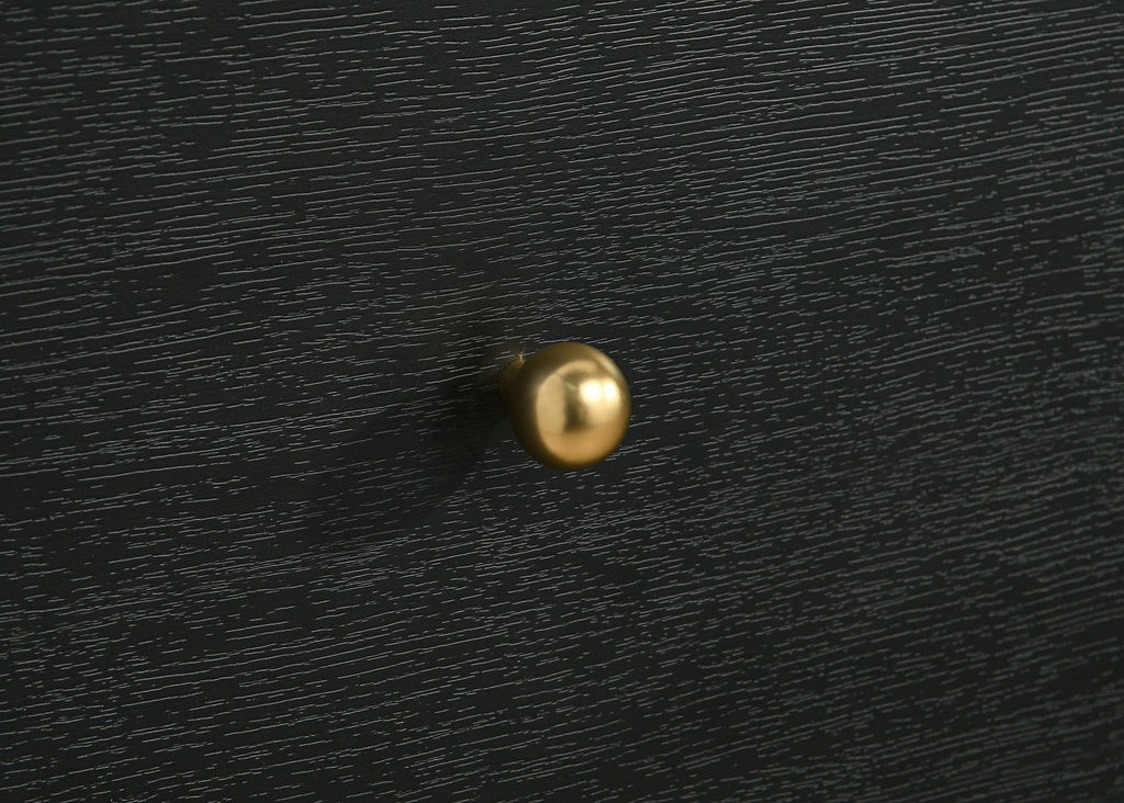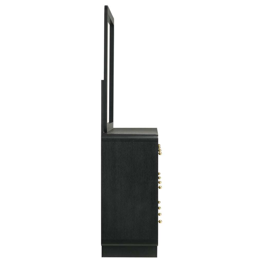 Augment bedroom storage with the plentiful drawer space and stylish presentation of this modern dresser and mirror combination. Its six large drawers facilitate easy organization of clothing and accessories. Each drawer is accentuated with ball knobs in a brass finish, offering warmth and contrast. The dresser and mirror each feature a black finish with rounded corners that soften the bold look and feel. The mirror pairs with a recessed base, each serving to lighten the overall look of this striking dresser. Key Features: • A modern six-drawer dresser and mirror provide plentiful bedroom storage and style • Features a black finish case and mirror frame with rounded corners for an inviting presentation • Charming petite ball knobs receive a brass finish, adding glamour and contrasting dimensionality • Made with melamine veneer that resists scratches and dents for excellent longevity and performance • Drawers feature metal extension glides for seamless performance and operation
