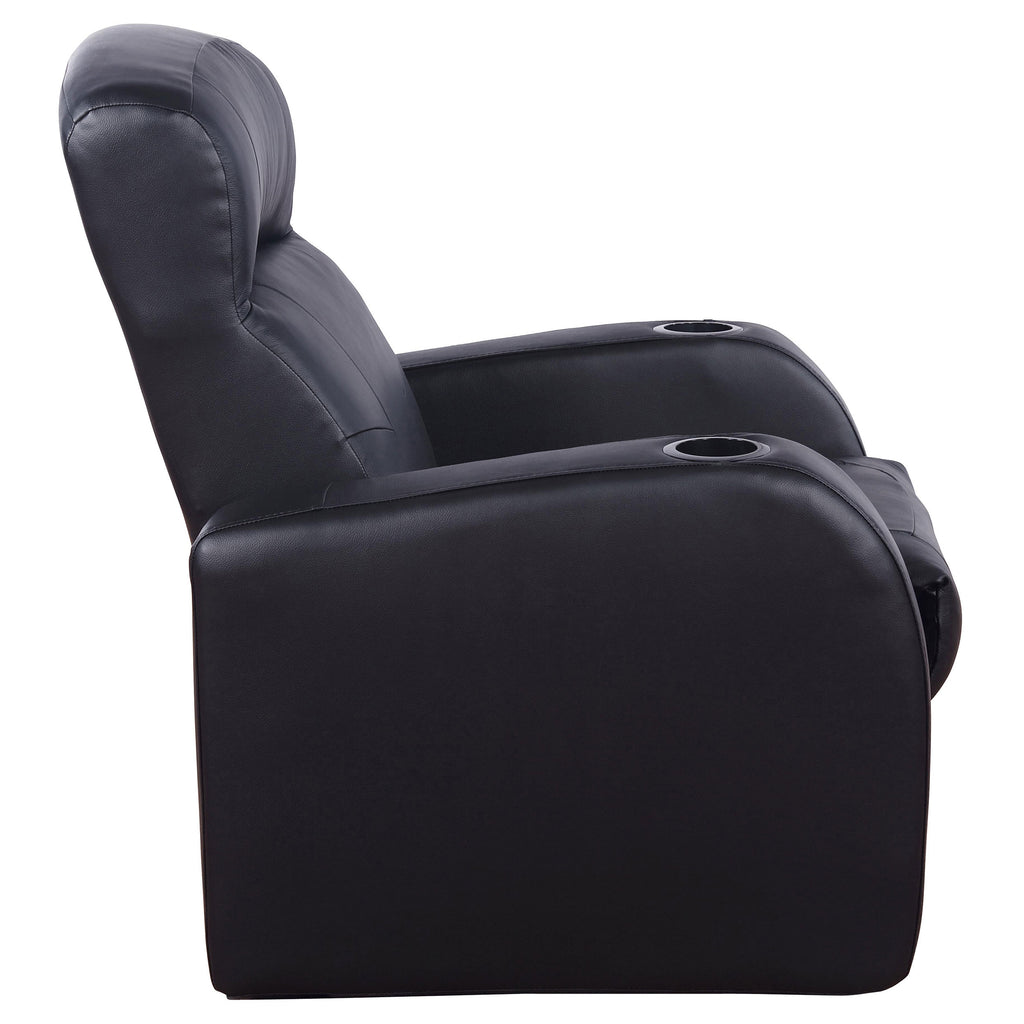 Enjoy the perfect blend of sophistication and comfort with this black leather recliner. Upholstered in smooth top grain leather everywhere the body touches, it offers a sleek, modern silhouette with refined stitching details. A high back cushion and low rounded track arms provide ergonomic support, while the pocket coil seating ensures long-lasting comfort. With a wall-hugger mechanism, this recliner saves space while delivering full relaxation, making it an ideal addition to a home theater or living room._x005F_x000D_ Key Features: • Modern recliner upholstered in black top grain leather everywhere the body touches • Wall-hugger mechanism allows full recline while conserving floor space • High backrest and low rounded arms provide ergonomic comfort and support • Supportive pocket coil seating ensures lasting durability and relaxation • Dual cupholders integrated in the armrests for convenient beverage placement • Crafted with acacia, foam, leather, and plywood for strong reliable build