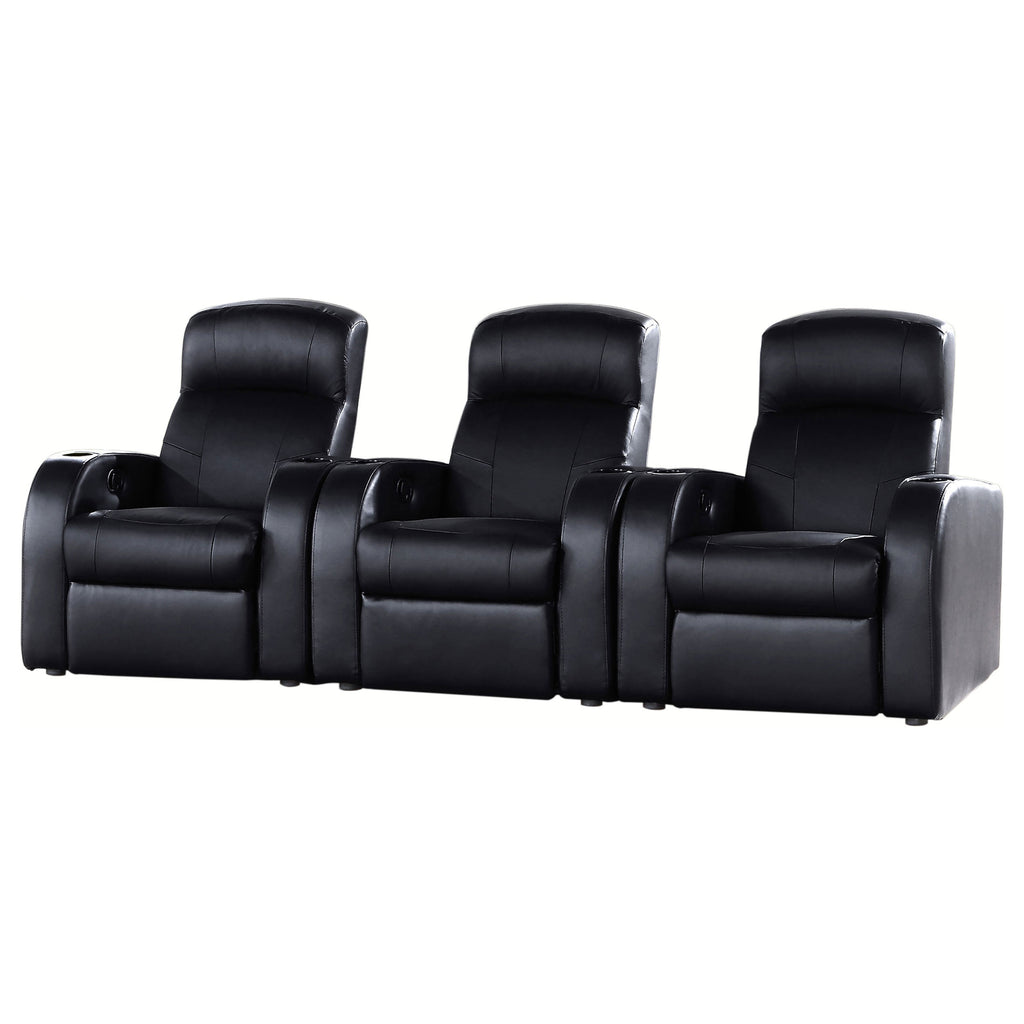 Experience cinematic luxury at home with this sleek home theater seating collection. Each recliner is upholstered in smooth black top grain leather everywhere the body touches, offering both elegance and durability. Designed with high backs, supportive pocket coil seating, and wall-hugger mechanisms, the recliners maximize comfort and save space. Built-in cupholders provide convenience, while optional wedge consoles add soft-closing storage for remotes and accessories. Modern stitching and rounded track arms complete the refined look, making this collection the ultimate in home entertainment seating._x005F_x000D_ Key Features: • Three top grain leather recliners create a sleek and modern home theater setup • Manual recline with wall-hugger design maximizes comfort and conserves space • High backrests and low rounded arms provide stylish ergonomic support • Two wedge consoles add storage versatility with soft-closing lift-top design • Each recliner includes dual cupholders for convenient beverage placement • Built with acacia, foam, leather, and plywood for lasting durability and style