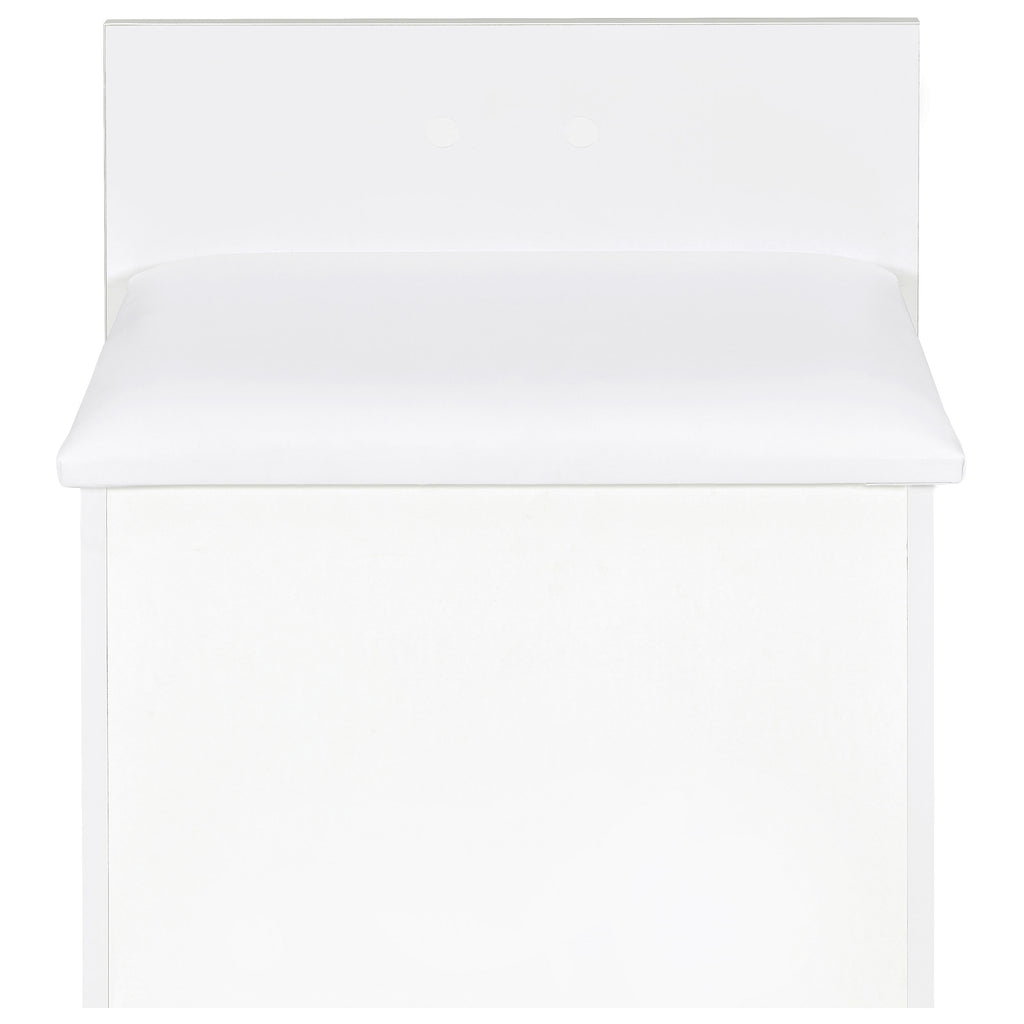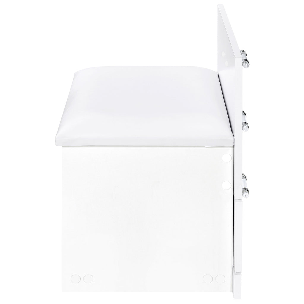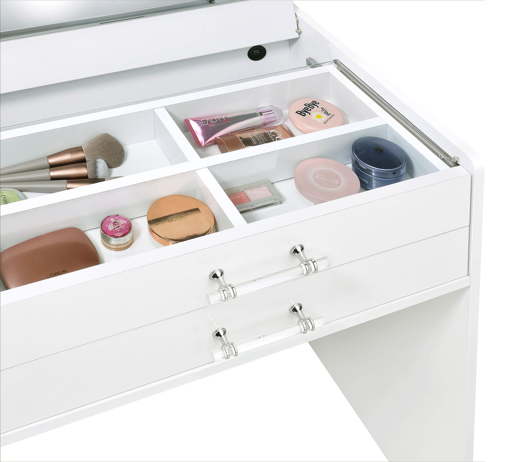 This high gloss makeup vanity set, crafted from engineered wood with eco-friendly laminate, blends seamlessly into your bedroom, doubling as a chic chest of drawers. The flip-top vanity mirror with LED lighting offers perfect illumination, while built-in dual USB outlets (Type A and Type C) allow for convenient device charging. The clear glass tabletop reveals a compartmentalized drawer for easy organization, and the cushioned vanity chair includes extra storage. Clear acrylic and chrome pull handles add a modern, elegant touch. Key Features: • White high gloss makeup vanity set crafted from engineered wood with eco-friendly laminate • Flip-top mirror with LED lighting for bright, even illumination • Built-in dual USB outlet with Type A and Type C ports for convenient device charging • Clear glass tabletop reveals a compartmentalized drawer for organized storage • Clear acrylic with chrome pull handles add a modern, elegant touch