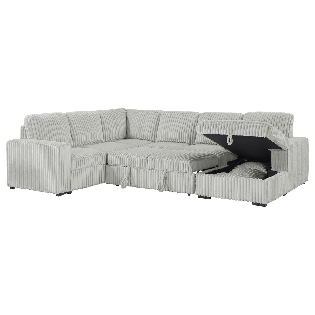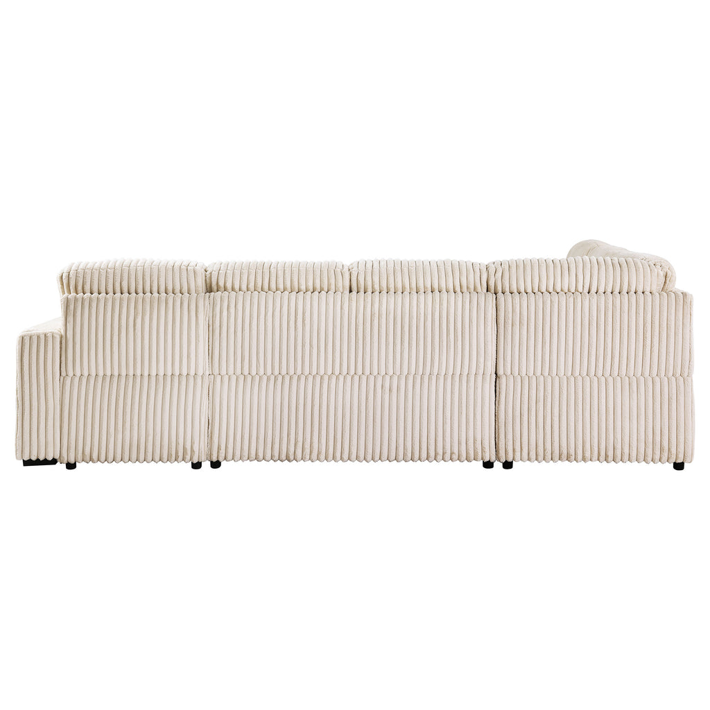 This versatile corduroy sleeper sectional effortlessly converts from cozy seating to a comfortable guest bed with its pop-up sleep surface. A spacious storage chaise keeps essentials at hand, while plush upholstery and three matching pillows provide lasting comfort and style. Its neutral tone complements any décor, making this piece an ideal centerpiece for relaxation, entertainment, and accommodating overnight guests. Built for durability, it seamlessly blends form, function, and modern appeal. Key Features: • Versatile sleeper sectional adapts from seating to sleeping • Soft camel corduroy upholstery complements any interior style • Quick pop-up bed provides instant accommodations for guests • Hidden storage chaise keeps essentials organized and out of sight • Sturdy hardwood frame with sinuous springs and pocket coils for support • Attached seat, reversible back cushions, and matching pillows for comfort
