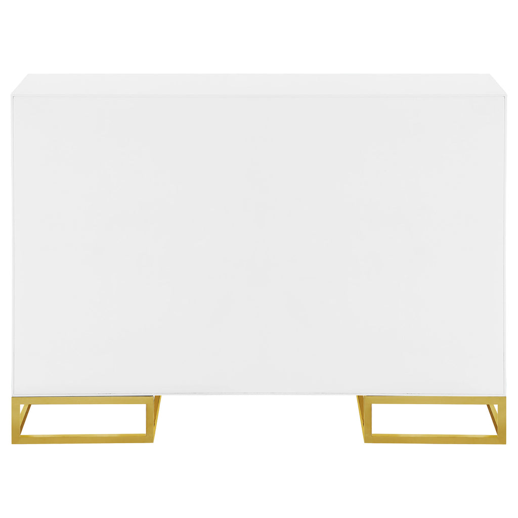 Add a bold statement piece to your space with this stunning modern accent cabinet. Featuring a glossy white finish with lustrous gold stainless steel trim, it showcases Art Deco flair with clean lines and geometric base supports. Behind double doors, adjustable shelves offer customizable storage. Crafted from durable MDF and stainless steel, this cabinet blends glamour and function beautifully in any setting. Key Features: • Sleek accent cabinet with bright white finish and glamorous gold trim • Art Deco-inspired stainless steel base adds bold architectural appeal • Double cabinet doors reveal adjustable shelves for versatile storage • Statement hardware and framed door panels enhance modern elegance • Made from wood, MDF, and stainless steel for durability and shine • Ideal for entryways, dining areas, or living rooms needing a luxe touch