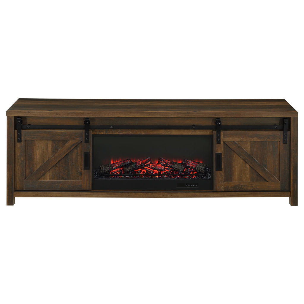 Rustic design meets modern warmth in this fireplace TV stand, featuring a realistic ember display and a convenient wireless remote. The dark pine finish and black metal accents frame a charming barn door aesthetic, with sliding doors that conceal adjustable shelving on each side. Thoughtfully designed for both function and style, this entertainment console includes cord management cutouts and supports TVs up to 80 inches with ease. Please note that there is no heat function included. Key Features: • Fireplace TV stand in dark pine finish with black metal accents and sliding barn-style doors • Center fireplace insert without heat function and glowing ember display for cozy ambiance • Wireless remote lets you control flame brightness, and power with ease • Each barn door slides open to reveal an adjustable shelf for concealed media storage • Cord management cutouts keep electronics organized and cables hidden from view • Supports flat panel TVs up to 80 inches and built from engineered wood and melamine veneer