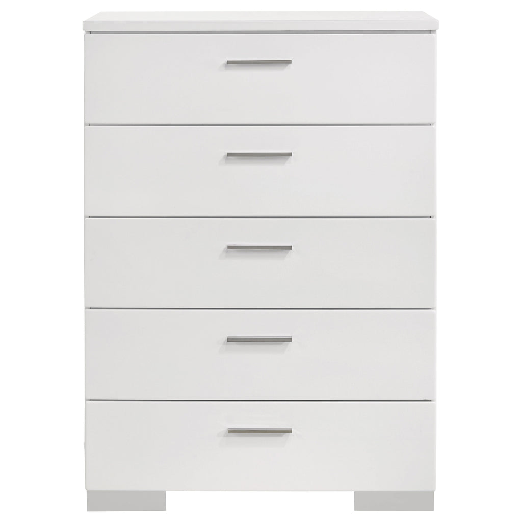 Maximize bedroom storage with this modern 5-drawer chest, designed with clean lines and a streamlined silhouette. A bright white high gloss finish creates a crisp, contemporary look, while chrome-finished handles and feet add a touch of refinement. Each drawer glides smoothly on metal extension hardware, offering easy access and reliable support. Built for everyday use, this chest delivers both function and polished style. Key Features: • Modern 5-drawer chest featuring a sleek and vertically oriented silhouette • White high gloss finish delivers a bright, crisp, and polished contemporary look • Five generously sized drawers offer ample storage for clothes and accessories • Chrome-finished metal handles and feet add refined, stylish visual contrast • Smooth metal extension glides ensure stable, quiet, and reliable drawer function • Built for durability with a clean-lined design ideal for modern bedroom storage