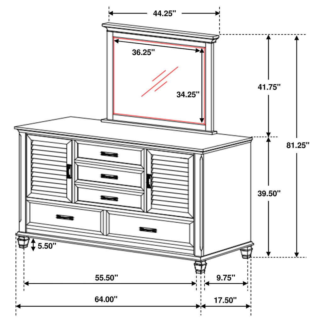 Introduce rustic elegance to your sleeping quarters with this spacious dresser, crafted from exceptional New Zealand pine with an antique white finish. The five soft-closing drawers and two side cabinets with shutter-style panels provide ample storage, accented by detailed crown molding and molded tapered legs. Pair it with the matching weathered sage mirror, its large rectangular shape and crown molding accents creating an enchanting prep spot atop the dresser, adding a touch of rustic flair and stylish impact to your room. Key Features: • Rustic dresser crafted from New Zealand pine with an antique white finish • Five drawers and two side cabinets with soft-closing glides for storage • Shutter-style panels and detailed accents for added flair • Antique white mirror with crown molding accent for rustic elegance • Sturdy framed mirror enhances the dresser and sleeping space