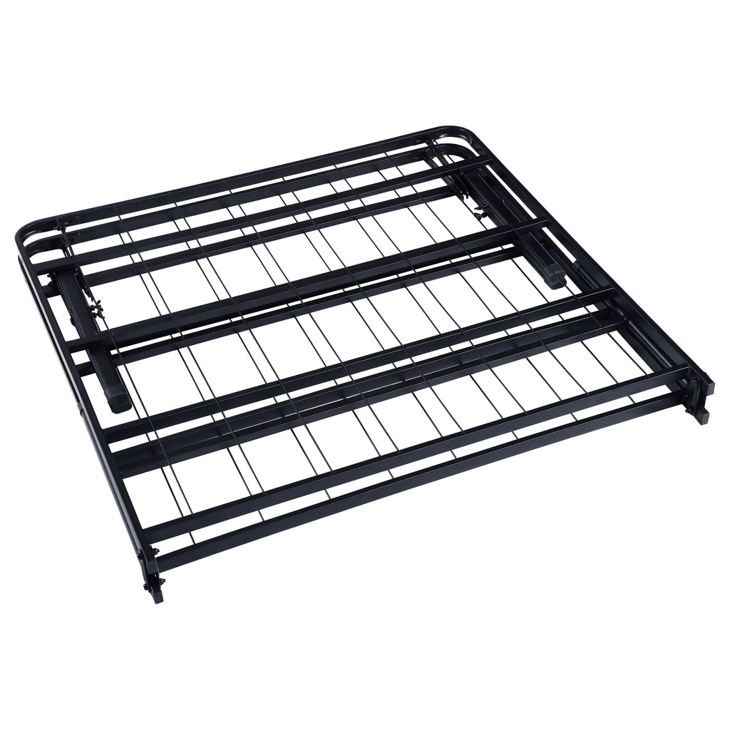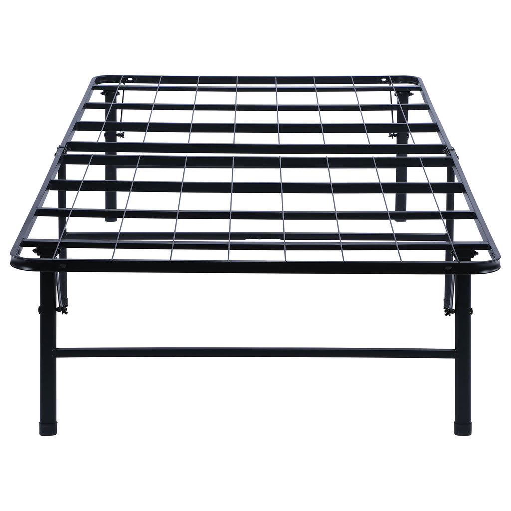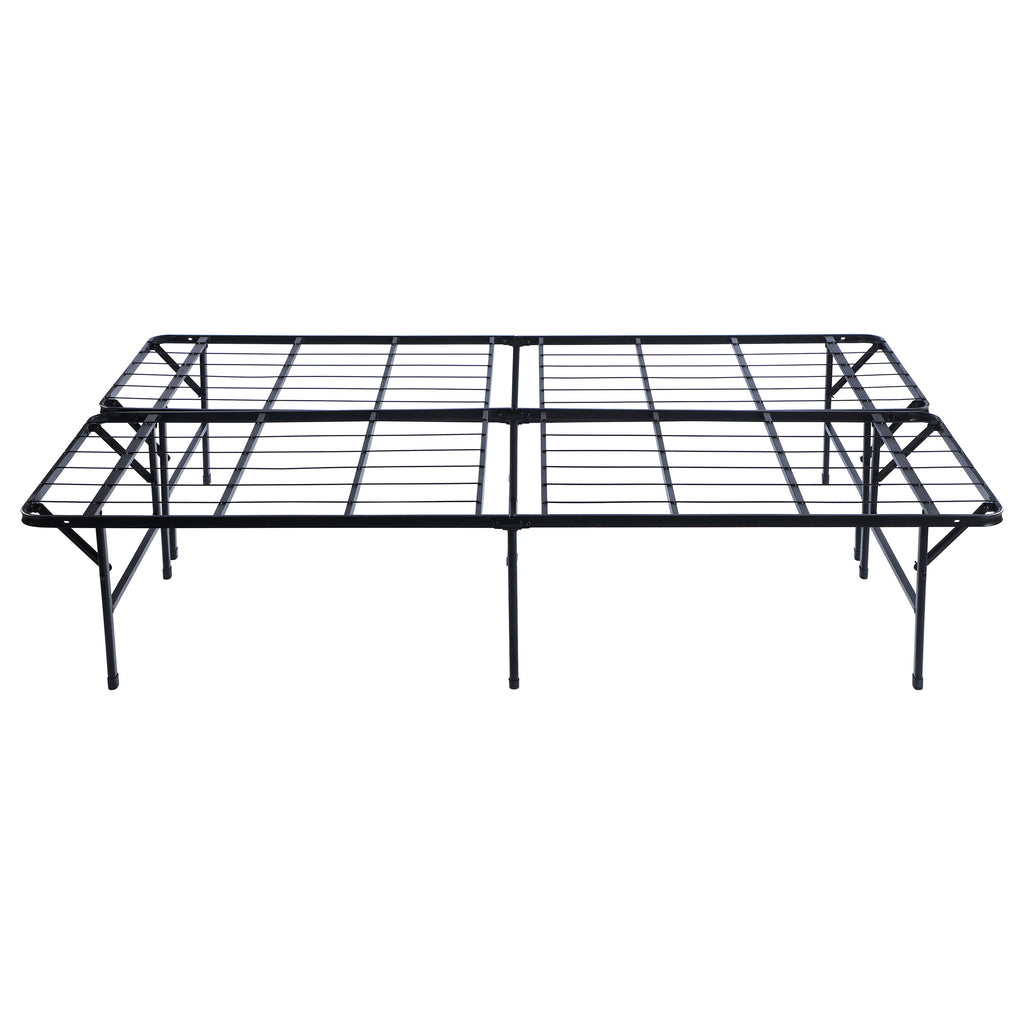 This simple transitional platform bed frame is both supportive and minimal. Easily storable and capable of folding, it can be pulled out when company visits. Its heavy gauge steel construction offers extra support, and has a black powder coated finish to protect against nicks while looking sleek and stylish. This bedframe can also be used as a standalone bed or to support a mattress to replace a box spring foundation. Included in this style are a variety of sizes to suit every mattress size. Key Features: • The epitome of simplistic convenience, this reliable folding bed frame in a black powder coated finish is a must-have platform base in every home • Innovative no-tool assembly makes this sturdy bed exceptionally portable and easy to store • Designed for long lasting durability and support while adding convenient underbed storage space for organizational versatility • Ideal as a standalone bed or inside a wood bed for mattress support, replacing the need for a box spring foundation • Unparalleled support for innerspring, foam, or any types of mattress you may have • Engineered with heavy gauge steel construction welded to create a strong foundation • Available in all bed sizes