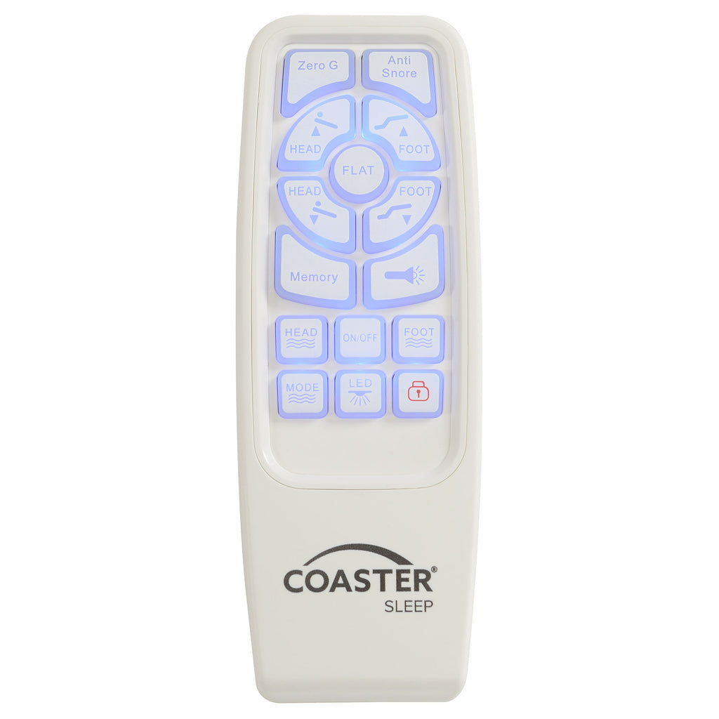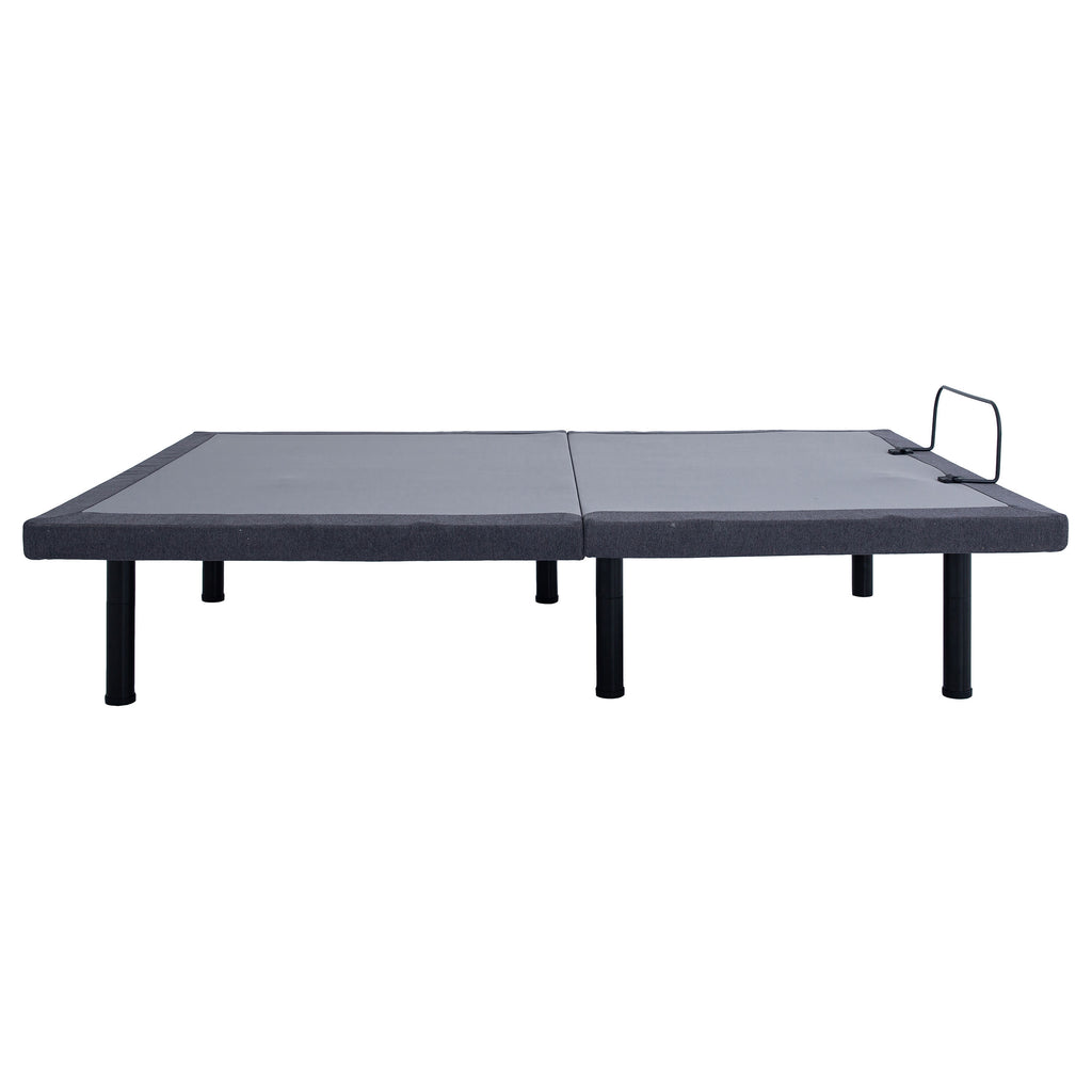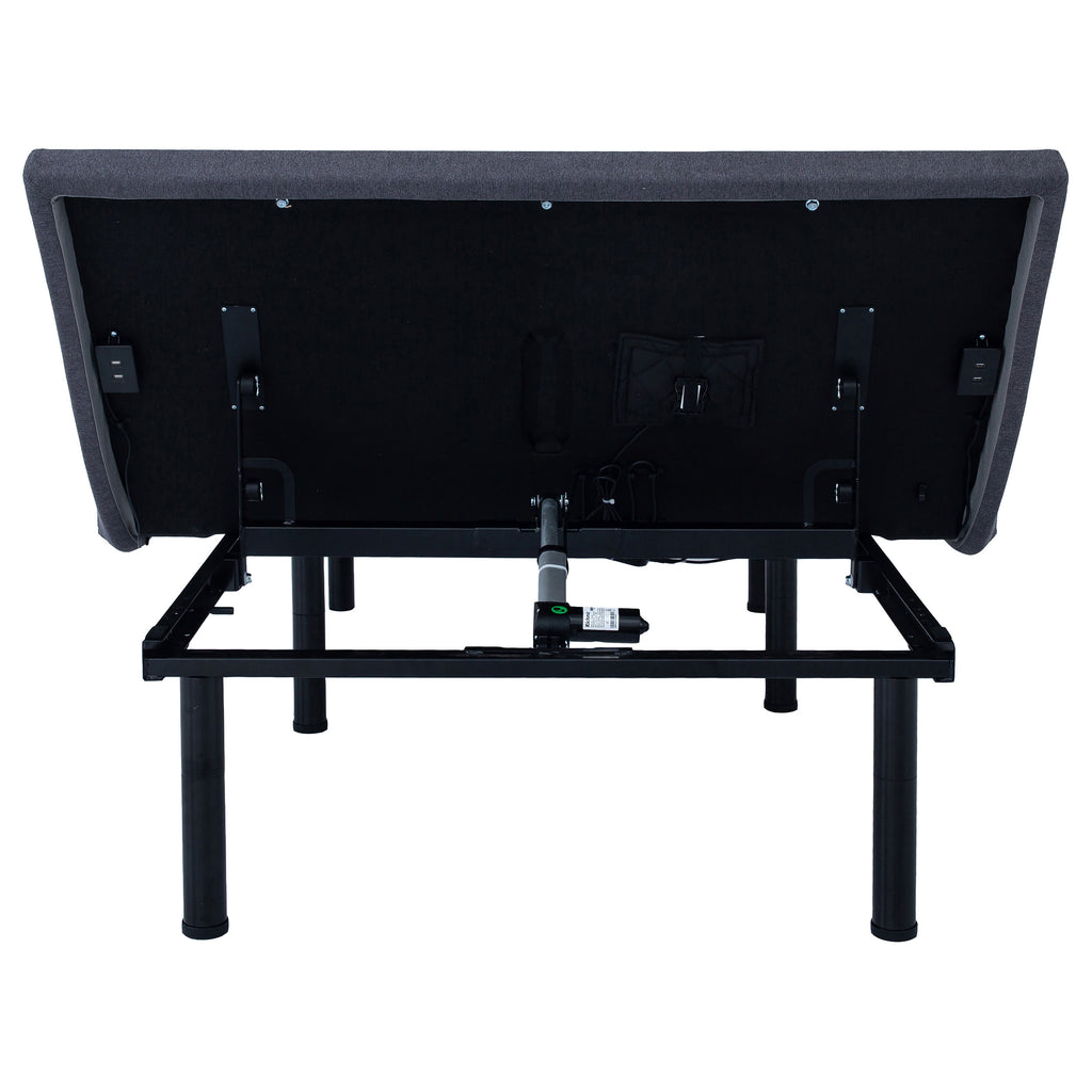 Revitalize yourself each and every night with this stunning multifunctional adjustable bed base with grey fabric trim and adjustable or removable legs. The bed base delivers the latest in modern technology with dual massage function on the head and foot of the bed, with three levels of intensity for optimal relaxation. The bed is equipped with a wireless remote that's backlit and gives full control of the height of the head and foot of the bed and includes presets for a most comfortable night's sleep. Each side of the bed is equipped with a dual USB port perfect for keeping bedside electronics charged and ready to use. You can even control the bed from your phone with Bluetooth connectivity and the Coaster app installed on your smart device. This premium adjustable bed base revolutionizes your bedroom into a relaxing multi-functional space and provides an abundance of features and customizable ergonomic positions to get great sleep and revitalize yourself. Key Features: • Wireless remote features backlit soft-touch controls for independent head and foot incline, preset Zero Gravity/Antisnore/Flat/Memory positions, as well as a handy integrated flashlight • Dual massage on head and foot with 3 levels of intensity will make lounging a relaxing a therapeutic dream come true • Dual USB charging stations on both sides keeps you and your partner's electronic necessities at arm's reach and ready to go • Underbed LED light offering a convenient nighttime solution when nature calls • Versatile 3-in-1 legs accommodate all types of beds, able to be adjusted to heights of 3-inch, 6-inch, 9-inch, 12-inch, or removed altogether to be placed onto a platform base • Emergency power-down feature in the event of a power outage