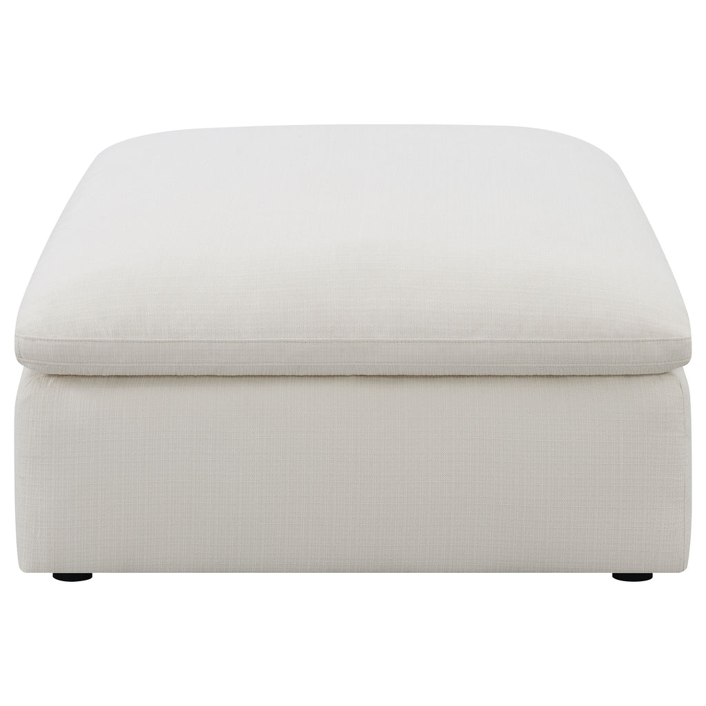 This square ottoman combines comfort with versatility, making it a stylish addition to any room. Upholstered in soft fabric, it features a generously padded cushion that offers a cozy place to rest your feet, serve as extra seating, or function as a casual coffee table. Clean lines and refined topstitching create a tailored, modern look. Treated fabric resists moisture, giving you time to wipe up spills with ease. Built with a sturdy wood frame, this ottoman is designed for long-lasting use. Key Features: • Square ottoman in ivory fabric with clean lines and refined stitched accents • Generously padded cushion provides lasting comfort for feet or seating use • Moisture-repellent treated fabric makes spills easy to wipe up quickly • Supportive foam cushioning offers durability and consistent resilience • Performance-grade fabric upholstery ensures strength and soft texture • Sturdy wood frame construction provides reliable everyday functionality