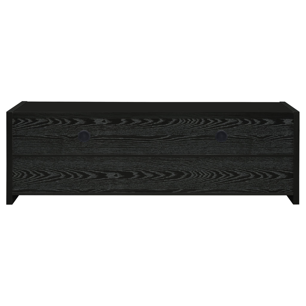 Enhance your modern living space with this 61-inch TV stand in a rich black oak finish. Designed to accommodate TVs up to 70 inches, it features a sleek profile accented by brushed silver hardware for a contemporary contrast. Two open compartments provide easy access for media components, while three spacious drawers store accessories, remotes, and gaming essentials. Crafted from engineered wood with a black tempered glass top, this stylish TV stand blends function and elegance with lasting durability. Key Features: • 61-inch TV stand accommodates TVs up to 70 inches • Black oak finish with silver hardware for modern appeal • Three drawers provide concealed storage for accessories • Two open shelves hold media devices and entertainment gear • Tempered black glass top adds sleek visual sophistication • Crafted from engineered wood and laminate for durability