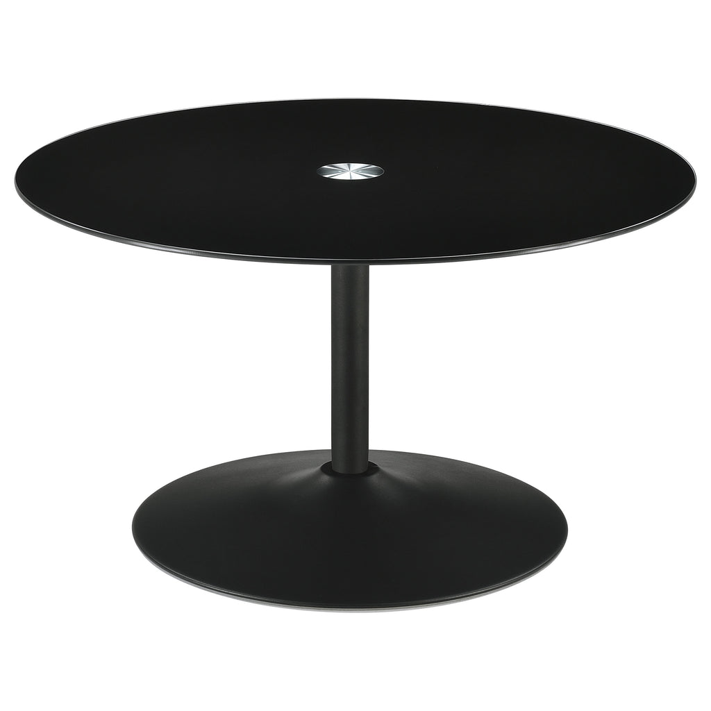 This modern coffee table showcases a sleek round design with a black tempered glass top, offering durability and style. The metal tulip base features a black powder-coated finish, creating a seamless and contemporary aesthetic. Perfect for living room settings, this cocktail table combines function and modern flair. Its sturdy construction ensures reliable support, while the minimalist design makes it a versatile centerpiece for any space. Key Features: • Coffee table with a durable, round black tempered glass top for a modern look • Sturdy metal tulip base with a protective black powder-coated finish • Sleek design adds contemporary elegance to living room spaces • Tempered glass surface resists daily wear while maintaining its aesthetic appeal • Powder-coated metal base offers long-lasting durability and scratch resistance • Versatile cocktail table designed to complement a range of decor styles