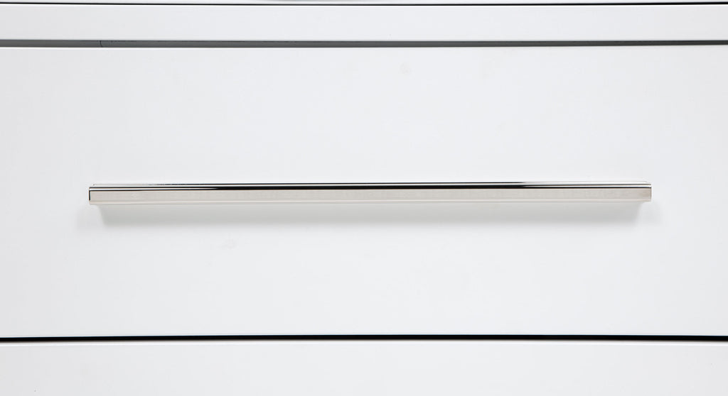 This eight-drawer dresser exudes modern sophistication through a sleek silhouette and softened edges. Elongated brushed nickel pulls and vertical tube accents create visual interest while enhancing the dresser’s clean structure. Built from solid rubberwood, engineered wood, and finished with a smooth laminate veneer, it offers ample storage and felt-lined top drawers. Designed for refined function in any contemporary bedroom. Key Features: • Eight-drawer dresser with softened corners and a clean-lined, modern silhouette • White finish contrasts with brushed nickel pulls and vertical metal tube accents • Felt-lined top drawers with tinted interiors provide secure, organized storage • Drawers feature dovetail joints and glide smoothly on heavy-duty metal glides • Made from solid rubberwood, engineered wood, and smooth laminate veneer • Fully assembled dresser includes integrated tip-over restraint for added safety