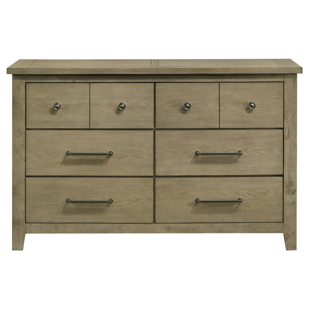 Bring refined rustic warmth to your space with this six-drawer dresser, finished in vineyard oak with embossed oak grain for natural texture. Crafted from solid rubberwood and engineered wood veneer, it balances durability with timeless appeal. Antique nickel metal knob and pull handles offer a subtle metallic contrast, while heavy-duty metal ball bearing extension slides ensure smooth, long-lasting drawer use. The clean silhouette and neutral tone suit a range of transitional and contemporary bedrooms. Key Features: • Six-drawer dresser offers rustic-modern balance with clean lines and smart function • Solid rubberwood frame with embossed oak grain veneer in vineyard oak finish • Antique nickel metal knob and pull handles offer contrast and refined character throughout • Spacious drawers provide everyday storage for clothing and accessories • Heavy-duty metal ball bearing extension slides ensure smooth and lasting drawer performance • Fully assembled dresser includes tip-over restraint for enhanced bedroom safety
