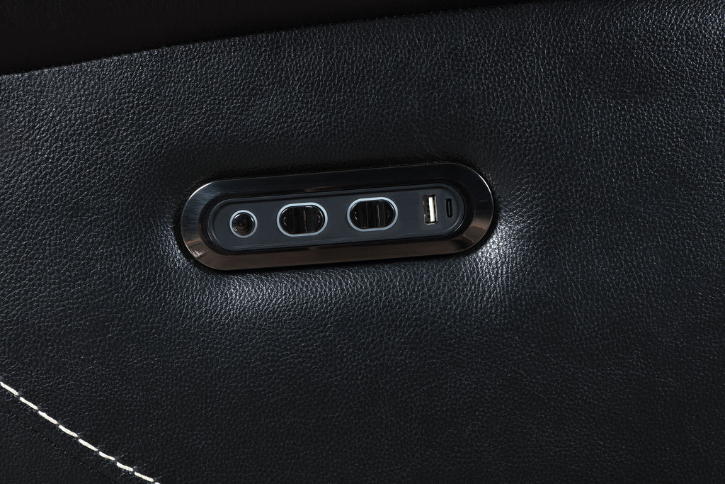 Commanding comfort and tailored power define this leather dual power recliner chair. Upholstered in black top grain leather everywhere the body touches, it features dual power controls for independent adjustment of the headrest and footrest. A built-in control panel includes dual USB ports with both USB-A and USB-C for effortless charging. Channel tufting and contrast stitching add refined dimension to its bold, supportive form. Key Features: • Dual power recliner with independent headrest and footrest adjustment functions • Top grain leather where the body touches offers a smooth, high-end seating feel • Control panel includes dual USB ports with USB-A and USB-C for device charging • Channel tufting adds support and visual texture to seat and backrest zones • Contrast stitching outlines the form with modern, tailored definition • Plush padded arms and deep cushioning provide full-body relaxation and support