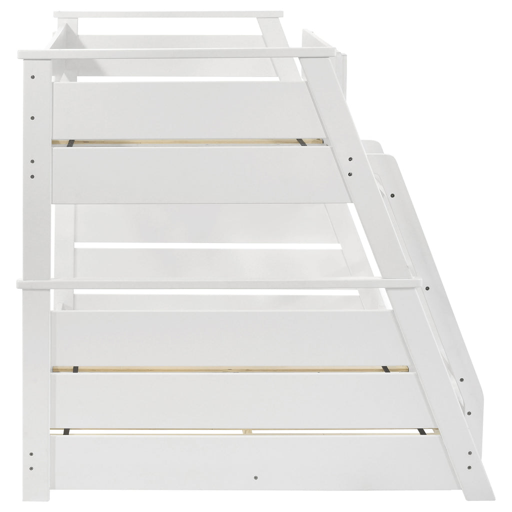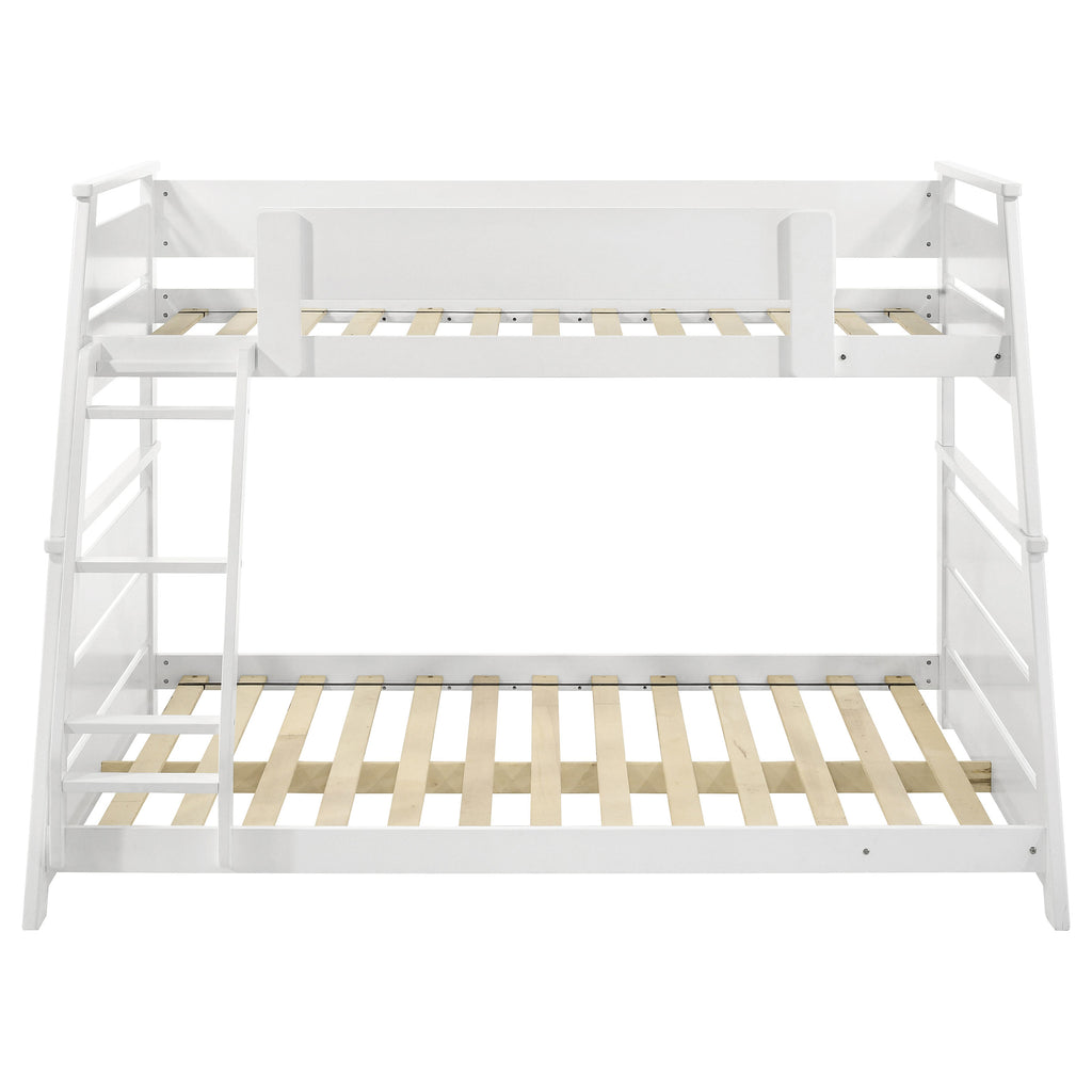 Elevate any teen’s room with this versatile twin-over-full bunk bed, blending functionality and style. Crafted from solid rubberwood, and engineered wood, its sturdy frame is designed for durability and timeless appeal. Designed with safety in mind, the upper bunk features a partial guardrail, while the reversible angled ladder offers easy access. A complete slat kit is included, making the bed mattress-ready without the need for a box spring, combining convenience with practical design. Key Features: • Twin-over-full bunk bed with a warm walnut finish for a cozy, stylish appeal • Sturdy construction from solid rubberwood, and engineered wood ensures durability • Sleek, angled design complements modern and transitional room styles • Reversible angled ladder provides versatility and easy access to the top bunk • Complete slat kit included for mattress-ready functionality without a box spring • Combines robust craftsmanship with space-saving, practical design