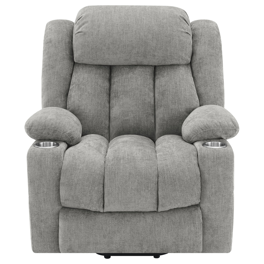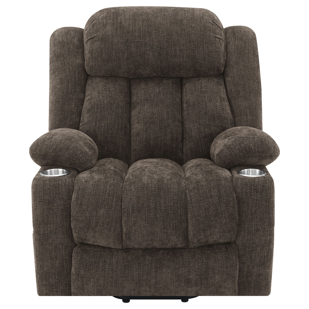 Upgrade your living room seating options with a traditional power lift recliner. It delivers excellent relaxation when lounging, and will provide an assist in getting back up to your feet. Its overstuffed look and dark brown upholstery create incredible comfort in your den or living room. Foam cushions and polyester fiber complement S-spring and pocket coil seating, with pillowtop arms for a cozy feel in any setting. The recline and lift functionality is controlled with a panel on the right-hand side of the recliner, and a USB port is built in to add a place to charge your phone or another device. Key Features: • Power lift adds easy functionality to a traditional power recliner with plush cushioning • Extra-plush foam and poly fill cushions deliver impressive support and comfort for lounging • Pillowtop armrests re complemented with metal cupholders that add a place for your drink • Power control panel includes a USB port perfect for charging your phone or other personal devices • Pocket coil spring seating and webbed decking ensure excellent support for lounging and relaxation