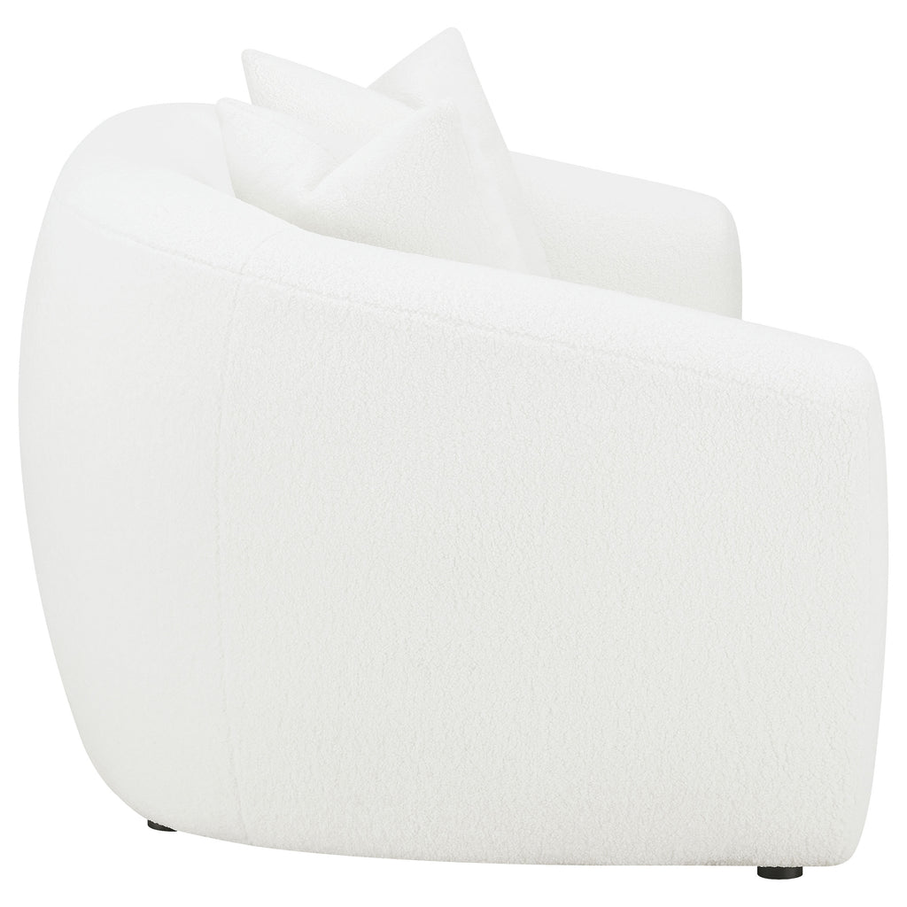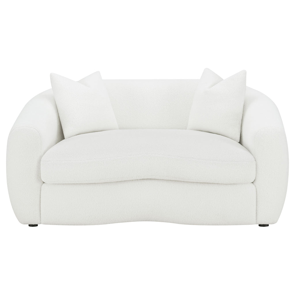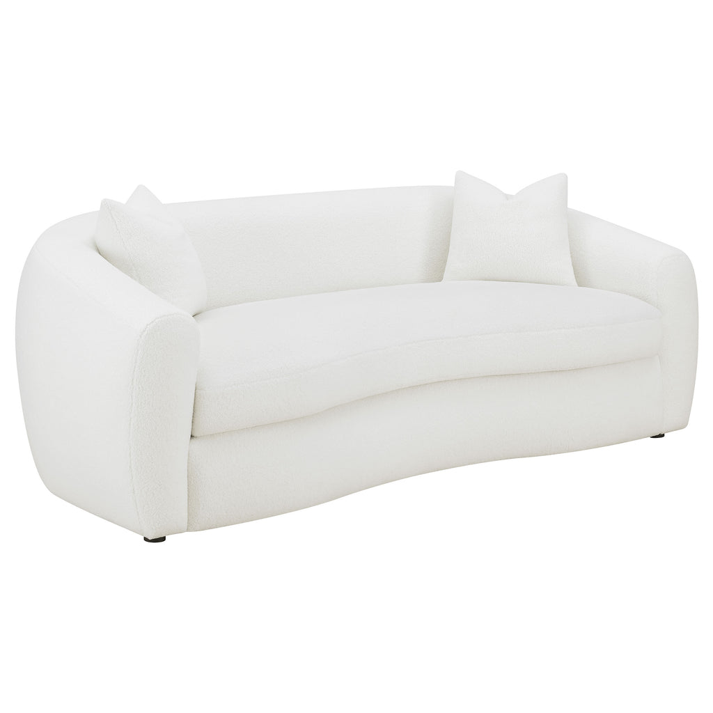 Softly sculpted and elegantly tailored, this modern sofa set exudes refined comfort through its plush faux sheepskin boucle upholstery. The gracefully curved silhouettes and sloped armrests bring an airy, cloud-like form that enhances any contemporary space. Plush cushions offer superior comfort and support, while faux down accent pillows provide inviting texture. Finished with black legs for a sleek contrast, this collection blends warmth, sophistication, and timeless design for the perfect modern retreat._x005F_x000D_ Key Features: • Two-piece sofa set upholstered in soft faux sheepskin boucle fabric • Curved silhouettes and sloped arms create graceful modern contours • Plush seat cushions offer exceptional comfort and inviting support • Tight backs preserve a smooth, tailored, and refined appearance • Faux down accent pillows enhance warmth and cozy sophistication • Black legs add sleek contrast to the neutral modern upholstery