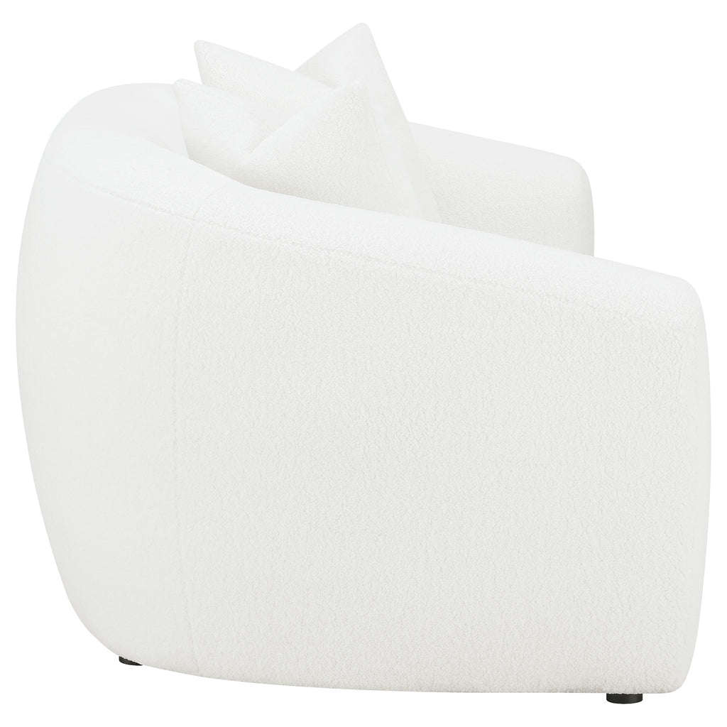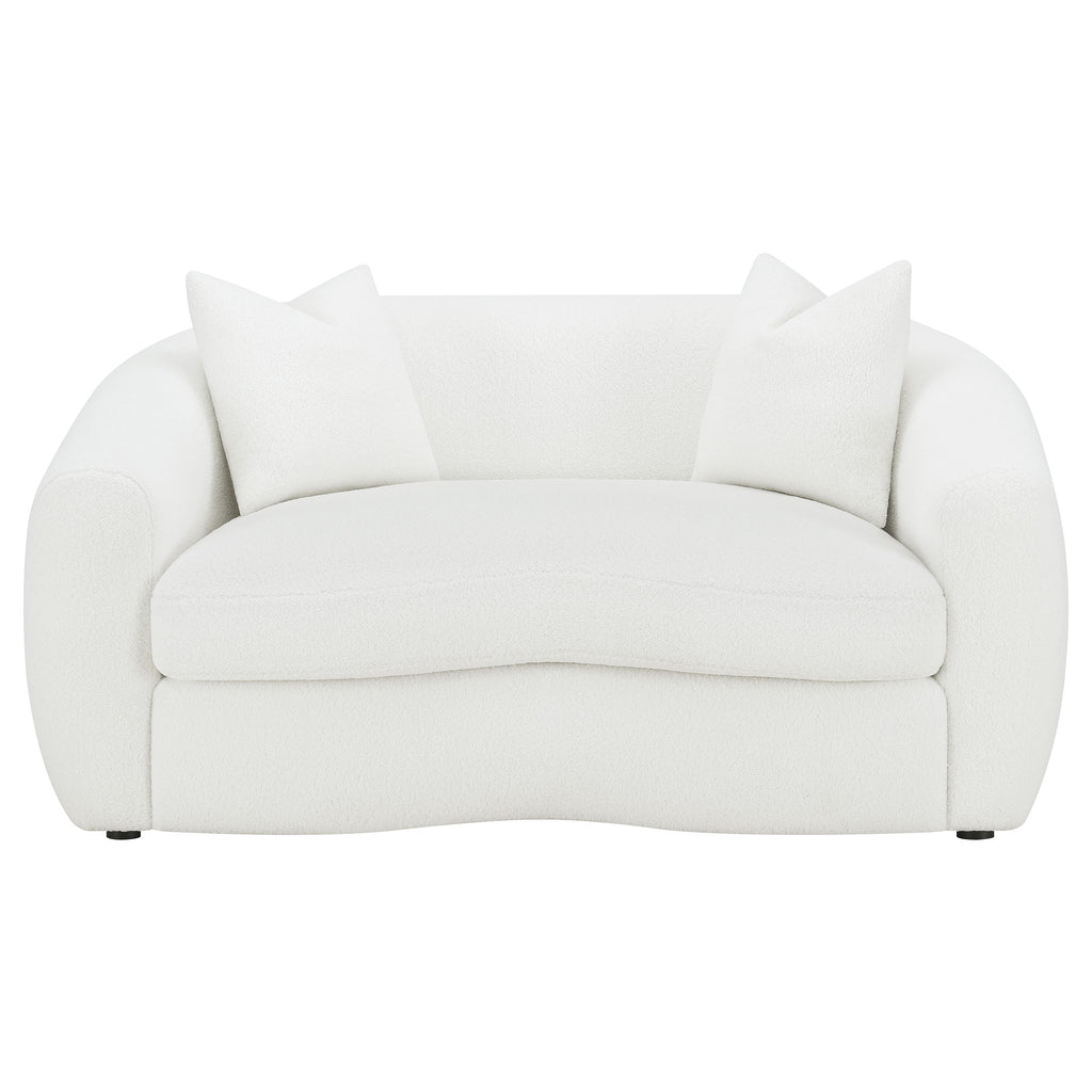 Invite cozy sophistication into your home with this elegantly contoured loveseat, upholstered in soft faux sheepskin boucle fabric. Its curved silhouette and sloped armrests create a smooth, cloud-like form that exudes modern charm. A single plush seat cushion offers comfortable support, while matching faux down-filled accent pillows add refined warmth. Supported by black legs for a hint of contrast, this loveseat blends contemporary elegance with inviting texture, perfect for modern and transitional interiors._x005F_x000D_ Key Features: • Curved loveseat upholstered in natural faux sheepskin boucle fabric • Graceful sloped arms and smooth contours showcase modern tailoring • Plush single seat cushion delivers comfort and lasting resilience • Tight back design keeps its refined and structured appearance • Includes accent pillows with faux down fill for added softness • Black legs contrast beautifully with the light neutral upholstery