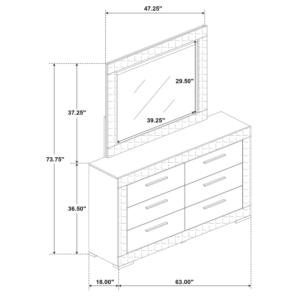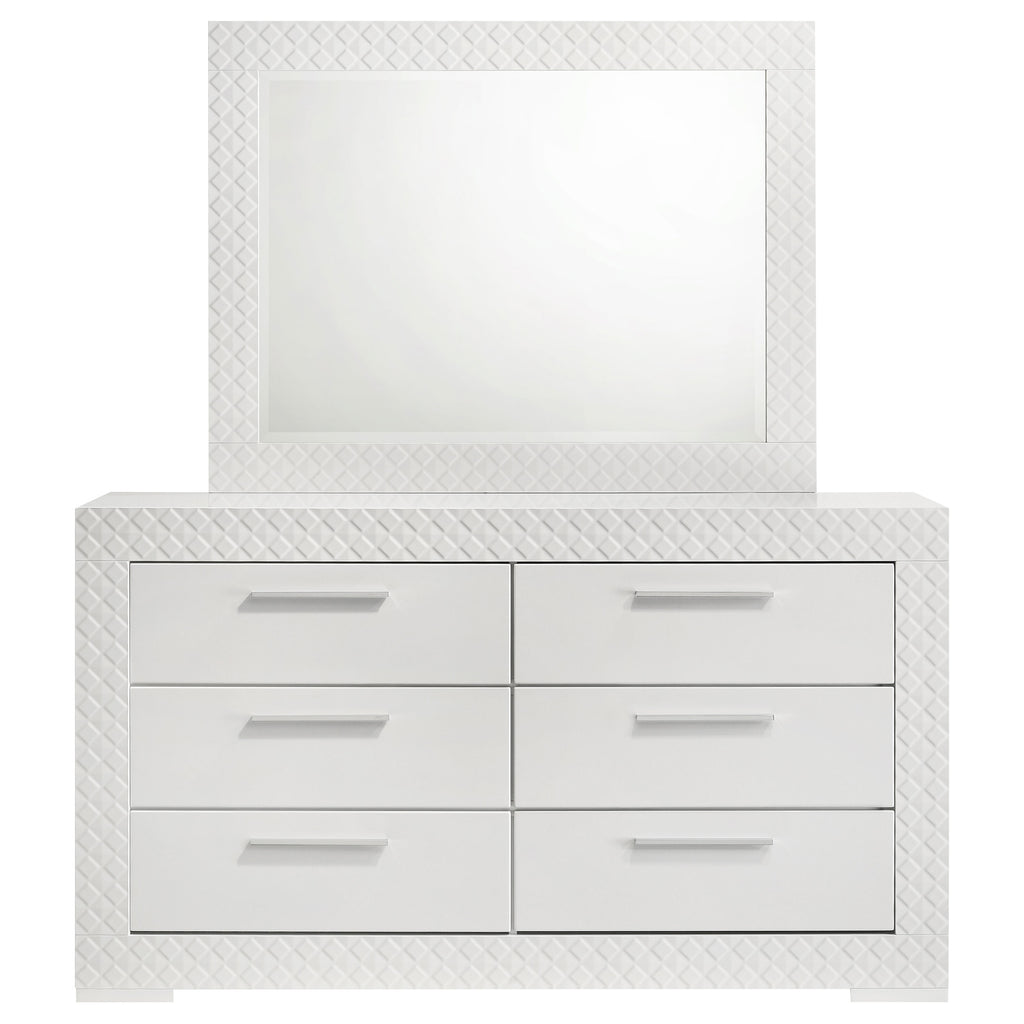 Bring a touch of modern luxury to your bedroom with this dresser and mirror set. Featuring a high gloss finish and 3-dimensional diamond tile emboss, this set exudes contemporary Italian style. The dresser offers ample storage with six spacious drawers, including felt-lined top drawers for delicate items. The matching mirror adds a cohesive element, enhancing the set's sophisticated design. This dresser and mirror set is perfect for those who appreciate refined aesthetics and quality craftsmanship. Key Features: • Luxurious dresser and mirror set with white high gloss finish • Dresser features six drawers with felt-lined top drawers • 3-dimensional diamond tile emboss for a modern touch • Matching mirror enhances the overall aesthetic • Constructed from solid hardwood and engineered wood