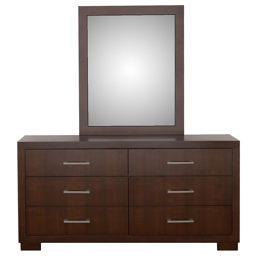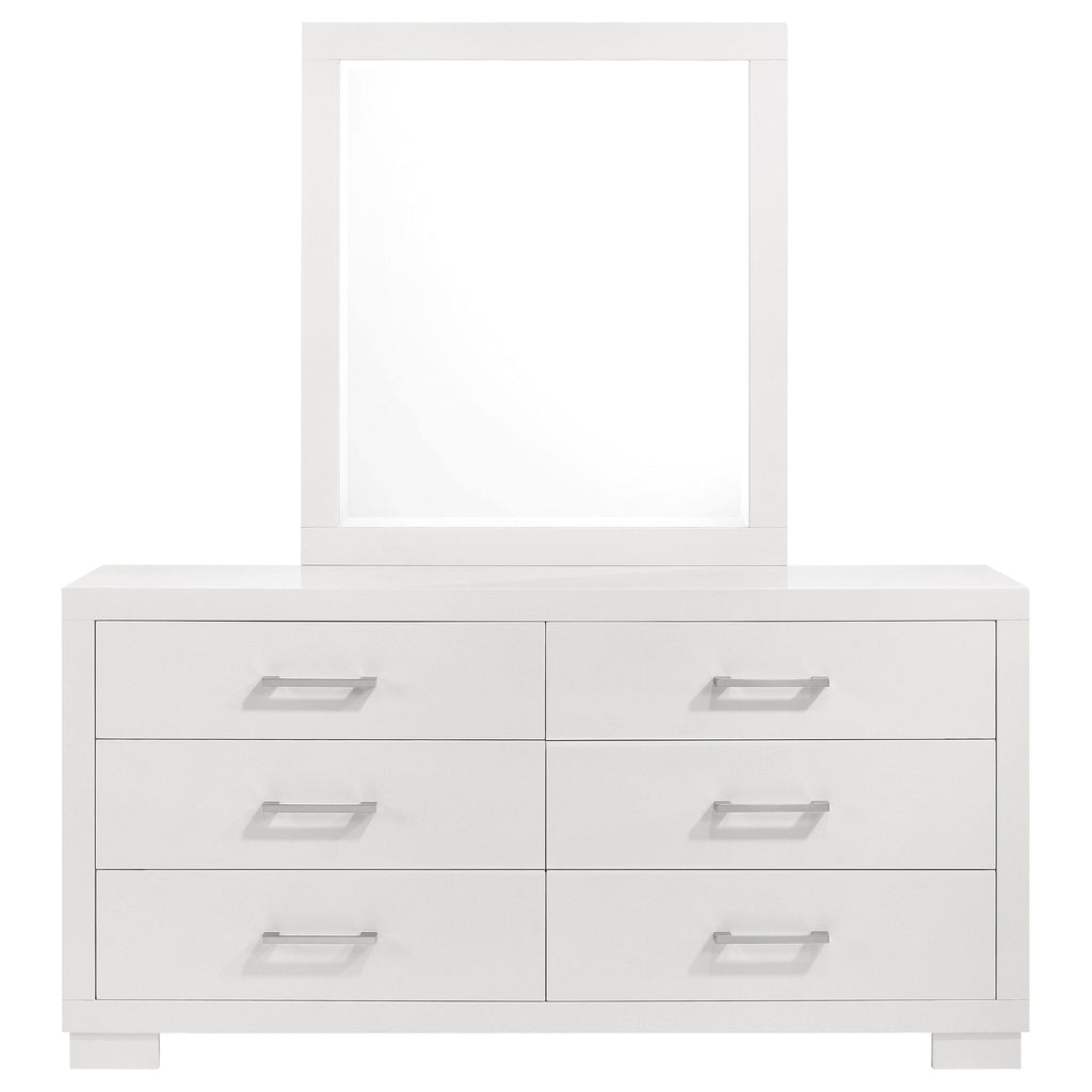 Elegant simplicity defines this dresser and mirror set, offering balance between refined design and everyday function. The six-drawer dresser provides generous storage, while the coordinating beveled mirror brings light and dimension to the room. Sleek bar pulls complement the sturdy wooden construction, creating a harmonious blend of practicality and sophistication. Perfect for modern bedrooms, this pairing completes the space with enduring grace and quiet elegance._x005F_x000D_ Key Features: • Six-drawer dresser and mirror set designed with crisp modern geometry • Snow white finish brightens and refreshes the surrounding space • Coordinating beveled mirror adds dimension and refined contrast • Felt-lined top drawers cradle keepsakes and delicate accessories • Silver-tone bar pulls highlight the sleek and graceful silhouette • Rubberwood and engineered construction ensures lasting durability
