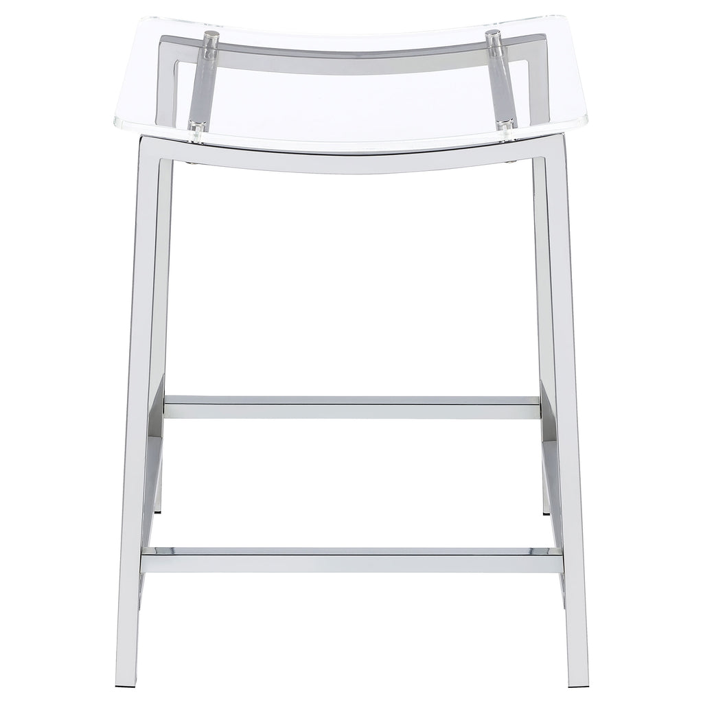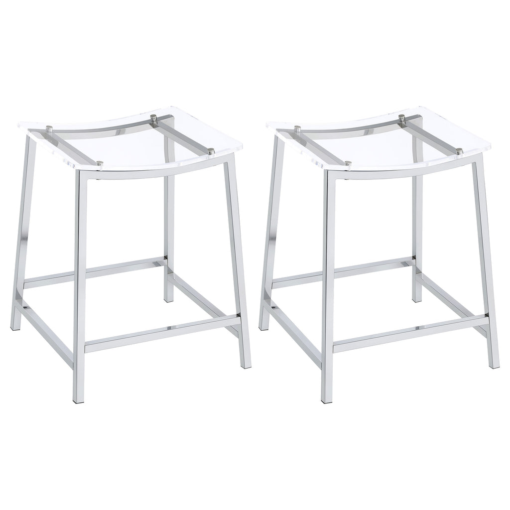 Pull up a stool and enjoy a casual modern entertaining experience from the privacy of your home. This set of two counter-height stools reflects ultra-contemporary design standards using crisp modern materials. Gleaming chrome finish metal framing includes a two-bar seat support and built-in footrests. A gently curved seat made of acrylic reveals the nuts and bolts of metal framing. Add this stool set to a sleek kitchen island or lounge space. Key Features: • Enjoy a casual modern entertaining experience in your home • Set of two counter-height stools with ultra-contemporary design • Gleaming chrome finish with two-bar seat support and built-in footrests • Gently curved acrylic seat reveals intricate metal framing details • Ideal addition for sleek kitchen islands or lounge spaces