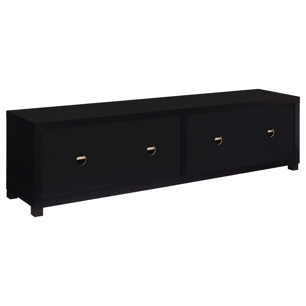 This 79-inch TV stand is the cornerstone of a home entertainment system, designed to anchor your viewing experience with both grandeur and functionality. Accommodating up to an 85-inch television, it brings cinema-scale enjoyment to the comfort of your living room. The quartet of doors opens to reveal adjustable shelves, offering tailored storage for all your media essentials. Crafted from engineered wood, this stand promises stability and longevity, allowing it to be a part of your home's stories for years to come. Its silhouette is as commanding as it is sleek, a testament to design that marries form with function. Key Features: • TV stand supports televisions up to 85 inches, perfect for a home cinema setup • Four doors with adjustable internal shelving for versatile storage solutions • Constructed from engineered wood for enduring stability and longevity • Streamlined black finish to complement any contemporary living space • Ample surface and storage space while maintaining a sleek profile