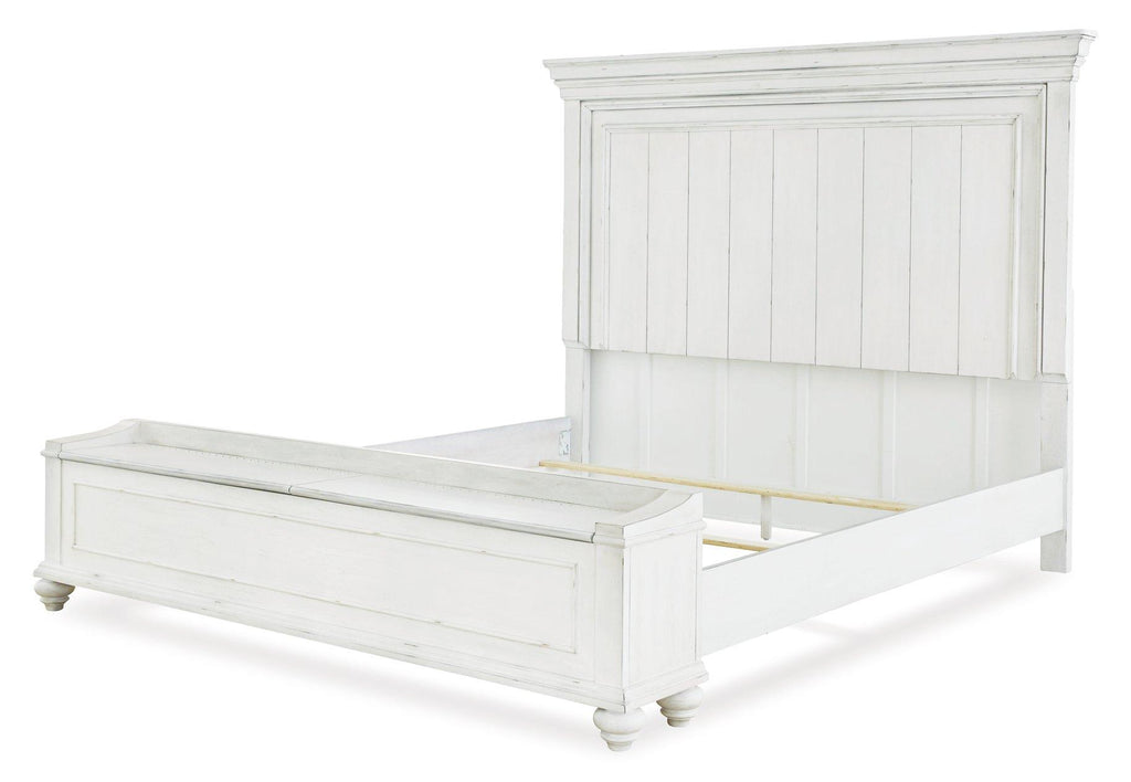 Give your retreat vintage charm with this queen panel bed and storage footboard. In a beautifully distressed whitewash finish, you'll love the headboard's grand style featuring a picture framed panel. The bench footboard is equally elegant offering extra storage and a convenient seat. Generously scaled moulding from top to bottom, along with bun feet give this bed character—evoking the feel of a quaint cottage escape.