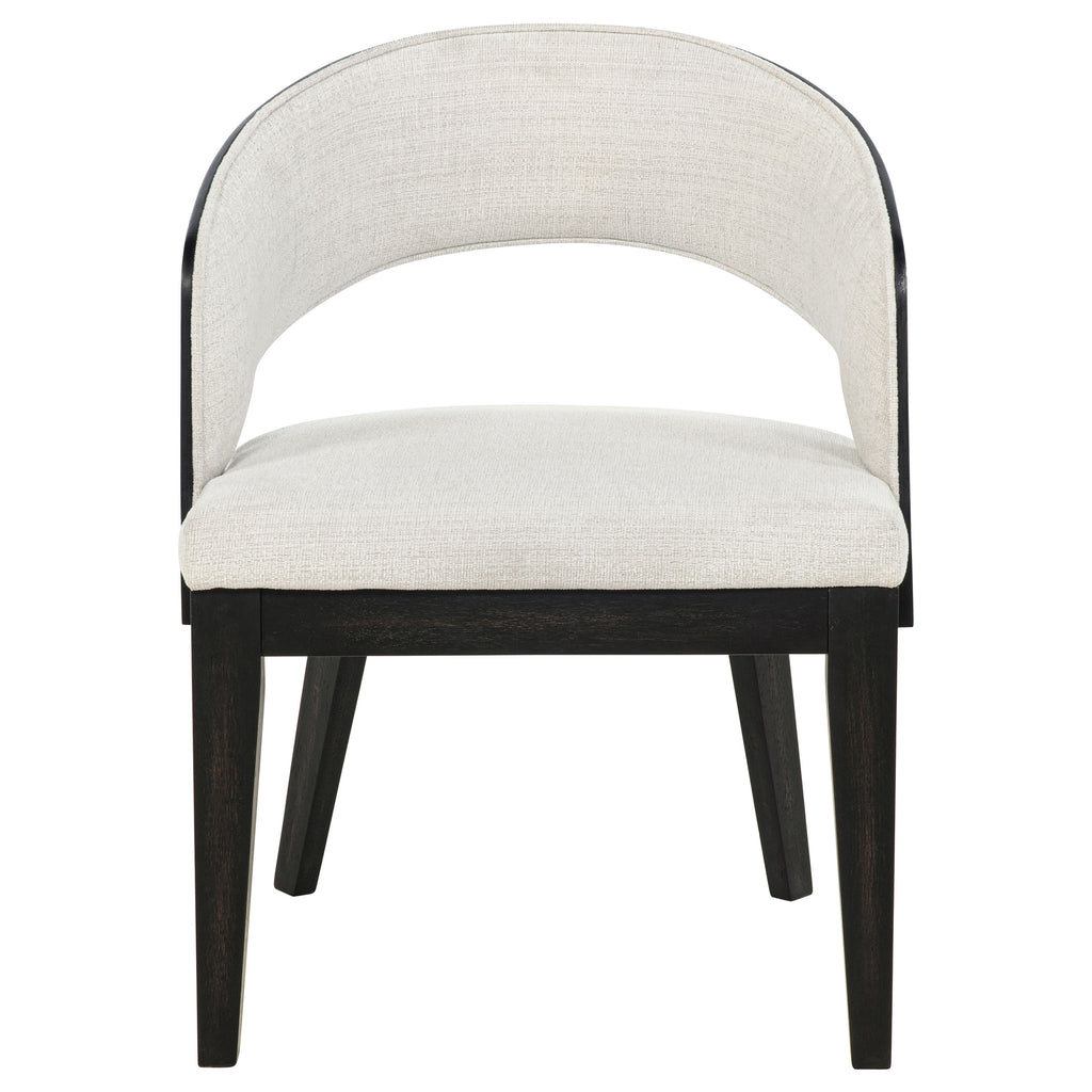 Every curve of this upholstered dining arm chair is a gesture of quiet sophistication. Its sculpted frame, finished in a deep burnished black, cradles a generously cushioned seat and softly wrapped backrest in creamy fabric. The open barrel design invites relaxed posture, while the smooth sweep of the arms lends an effortless sense of grace. Perfect for gathering, lingering, and savoring, this chair brings poetry to the table. Key Features: • Upholstered arm chair with sculptural barrel back and soft flared silhouette • Cream fabric contrasts beautifully with the burnished black wood frame • Curved backrest hugs the form while creating a light, open-arm profile • Foam-padded seat and back offer comfort for extended dining and gathering • Crafted from rubberwood, engineered wood, and textured polyester fabric • Designed to blend modern grace with an inviting, timeless presence