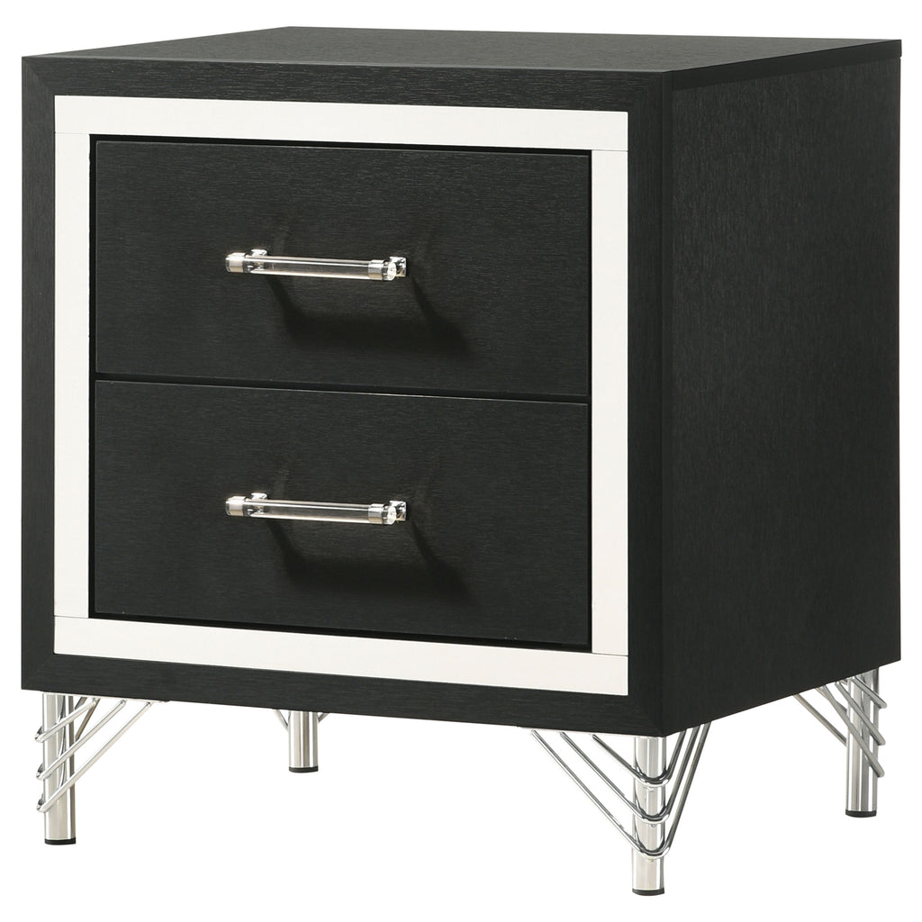 Gleaming chrome trim captures attention on a modern two-drawer nightstand. Perfect for your sophisticated bedside, it boasts a bold black finish case that offers the perfect touch of depth with its chrome trim. A pair of long bar pulls decorate drawer fronts. Hairpin style legs offer vintage flair and exceptional elegance. Two drawers add plentiful bedside storage, offering a place to ruck away personal items and overnight essentials. Key Features: • Chic touches bring glamour and elegant flair to a modern two-drawer nightstand • Bold black finish is crisp and clean in a sophisticated bedroom setting • Cool gleaming chrome finish trim highlights the front of the case, long bar pulls and decorative legs • Drawers add bedside storage to keep a tidy look and feel while ensuring necessities are in reach • Drawers includes English dovetail joinery that ensures utmost quality of construction