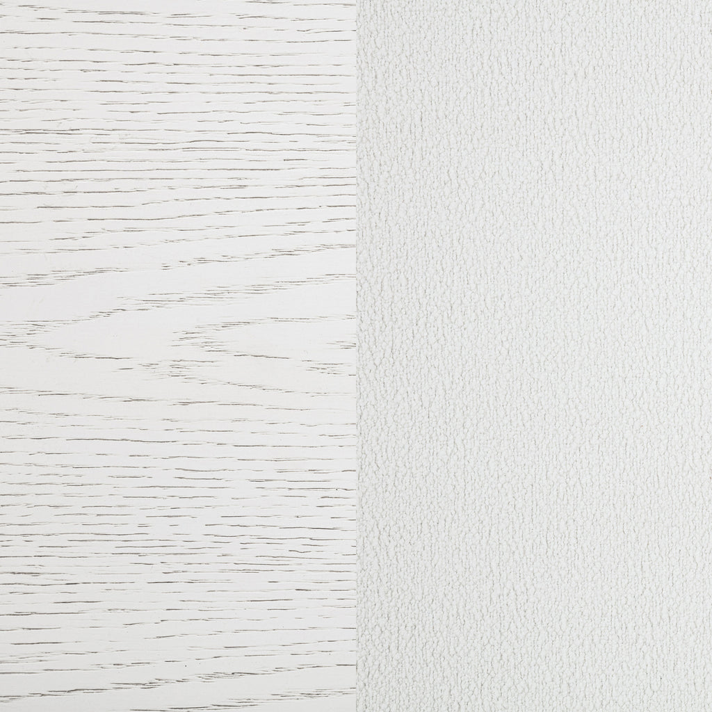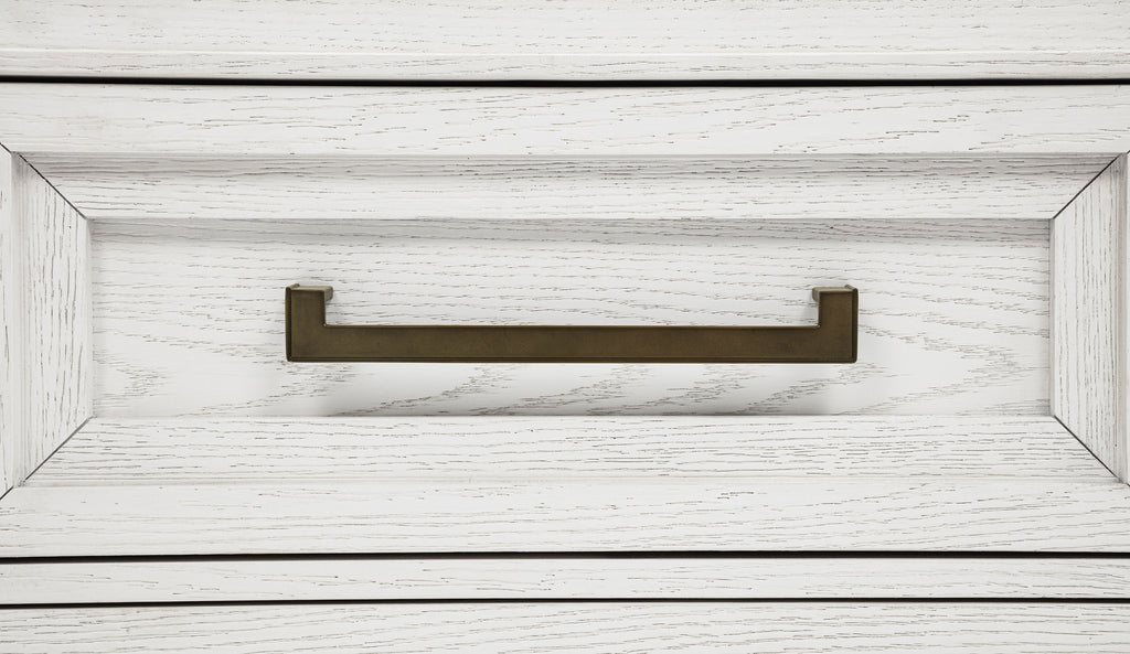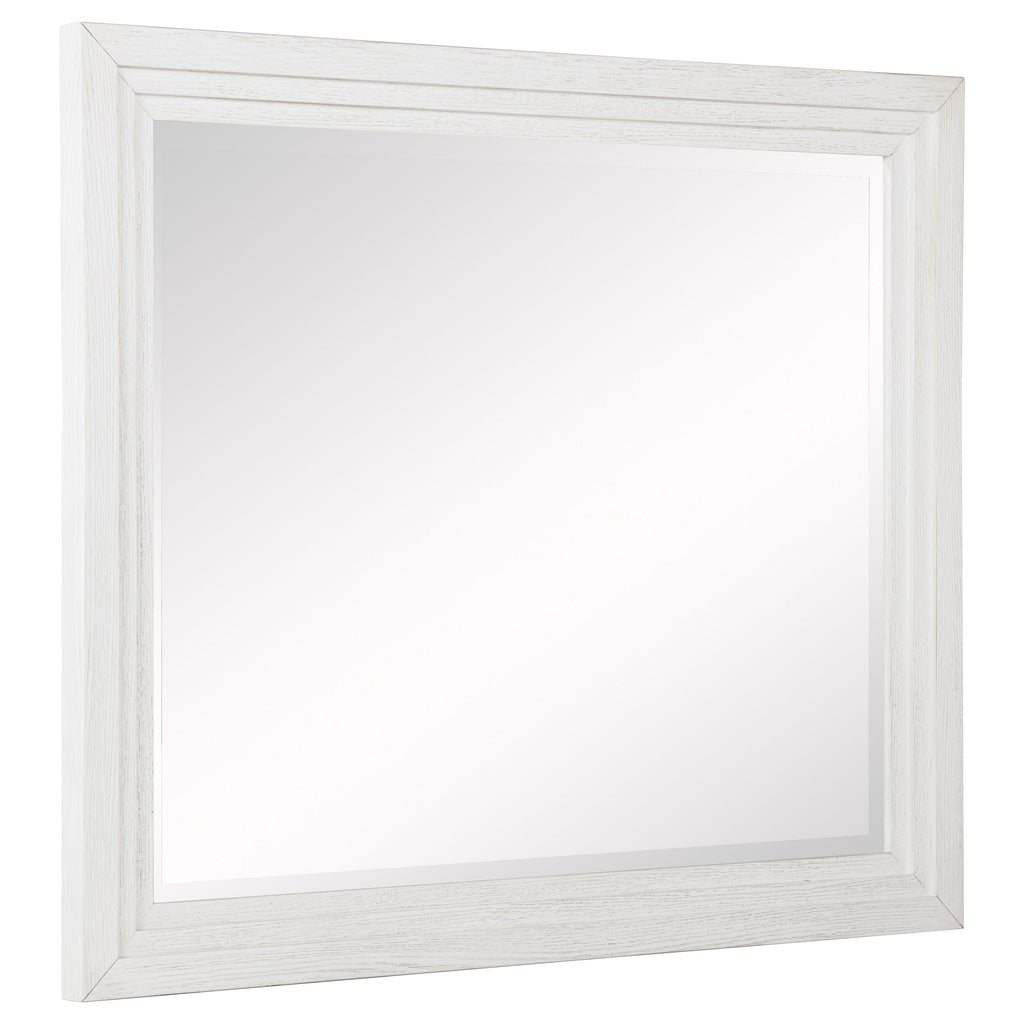 Embrace the fresh, contemporary style of a four-piece bedroom set. A distressed white finish highlights wood grain texture, while clean lines define the set with refined, inviting ambiance. The bed pairs a tall headboard and low footboard for an open profile adding to the modern appeal of this set. It includes a six-drawer dresser with a framed mirror, creating ample storage for clothing and linens. A two-drawer nightstand adds bedside storage and provides the perfect spot for a reading lamp or a vase of fresh flowers. Key Features: • A four-piece modern bedroom set offers a clean-lined silhouettes • Distressed white finish highlights wood grain details and bar hardware to create texture and depth • Six-drawer dresser and two-drawer nightstand offer plentiful storage and organization • The bed features a low footboard for an airy open look and requires a foundation