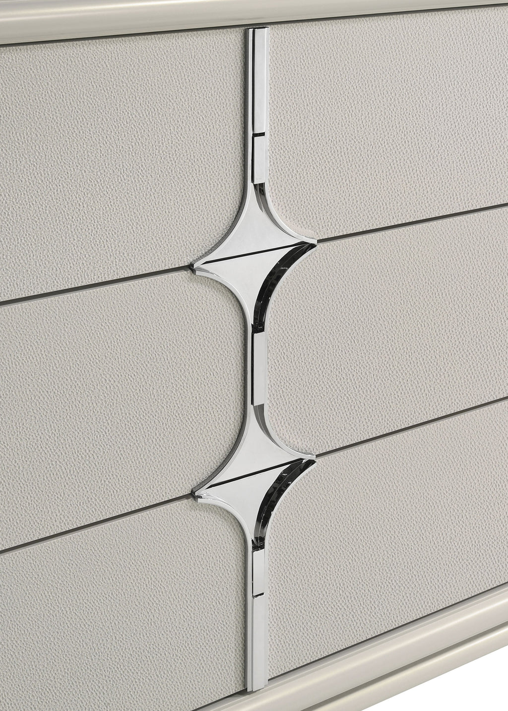 Redefine elegance in your bedroom with this sophisticated dresser and mirror set. The 6-drawer dresser, adorned with a pearl white finish and diamond star drawer fronts, exudes contemporary charm, while the mirror’s shaped beveled glass and touch LED lighting add a touch of modern luxury. Both pieces are accented with polished chrome and mirror framing, creating a cohesive and stylish look. The dresser offers ample storage with a secret jewelry tray for added convenience. This set effortlessly combines beauty and functionality, making it a standout addition to any bedroom. Key Features: • Elegant 6-drawer dresser and mirror set in pearl white finish • Shaped beveled mirror with touch LED lighting • Diamond star designs with removable jewelry tray in dresser’s top drawer • Polished chrome accents and mirror framing for a cohesive look • Crafted with solid hardwood, and engineered wood