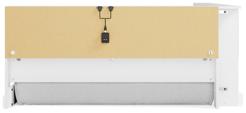 This full bookcase storage bed is an inspired find, beautifully blending contemporary and casual style. Its two-tone look in matte white and a replicated sugarberry wood grain pattern keeps things simple, while the bookshelf storage creates added function. This charming storage bed also offers slim-profile dual USB chargers and requires no additional foundation.