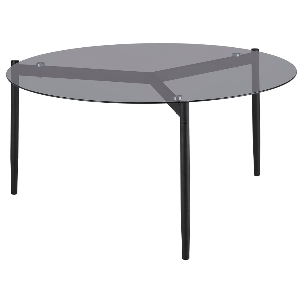 This modern coffee table features a sleek, tempered smoked glass top that adds sophistication to any space. Its sturdy metal base, finished in a black powder-coated sandy texture, provides stability and a contemporary edge. The round design creates a welcoming focal point, ideal for living room arrangements. This cocktail table combines minimalist style with durable construction, making it a perfect choice for modern and transitional interiors. Key Features: • Modern round coffee table with a sleek and minimalist design • Tempered smoked glass top adds durability and refined elegance • Black powder-coated metal base features a sandy textured finish • Sturdy construction ensures reliable performance for daily use • Clean lines and contemporary style enhance any living space • Perfect for living rooms, lounges, or open seating arrangements