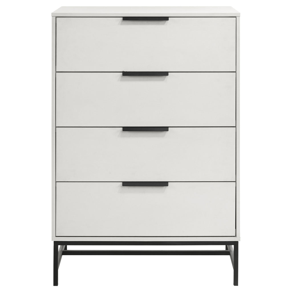 Create ample storage with the compact footprint of a modern four-drawer chest. Its roomy drawers are ideal for clothing, linens, and accessories, helping to keep your personal space tidy and organized. A white finish complements straight, clean lines, while black hardware adds contrast and depth. complementary metal base in black adds light, airy ambiance. Use the top for decor like photos, or add a jewelry box for a personal touch. Key Features: • A modern four-drawer chest features a sleek silhouettes and bold contrasting elements • White finish is crisp and bright, offering modern appeal and an open, airy feel • Black accents and hardware create a sense of depth and contrast in a contemporary bedroom • Four drawers provide plenty of space for clothing, linens, and other essentials • Drawers feature pin construction joinery and each has a generous 45-pound weight limit