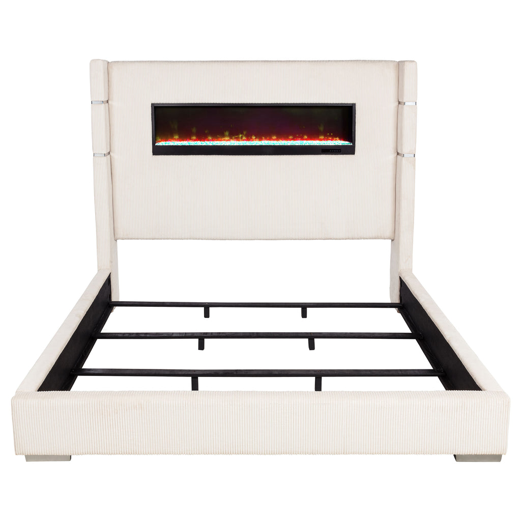 Transform any bedroom into a captivating sanctuary with this show-stopping bed, designed to draw attention and invite comfort. Available in plush corduroy upholstery, this bed effortlessly blends soft texture with modern sophistication. The integrated flame box offers a mesmerizing visual with 16 adjustable color options, all controlled via a convenient remote. With its eye-catching design and cozy feel, this bed elevates the bedroom experience while offering a stylish focal point. Key Features: • Queen size upholstered wingback panel bed with integrated flame box • Plush cream corduroy fabric for a soft, inviting feel • Flame box offers 16 color options, controlled by remote for ease of use • Remote-controlled flame effects for a customizable, calming ambiance • Solid construction for long-lasting durability and comfort