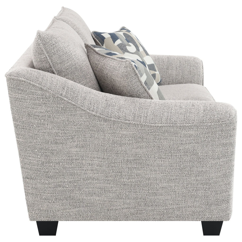 Instill a sense of comfort and inviting elegance in your living space with this well-tailored modern loveseat from our sofa collection. Showcasing a wonderfully textured boucle fabric in a multidimensional gray hue, it's not only contemporary and flexible but also perfect for camouflaging wear. The loveseat features sloped arms, boxed seat cushions, and tall back pillows, all finished with a welt trim, blending beautifully with existing furniture and decor. Its impressive comfort is augmented by foam cushions and the inviting look of gently sloping armrests. Resting on tall block legs for a sturdy foundation, this loveseat is a perfect addition to any casual living space, and can be further enhanced with accent pillows or a throw for a dose of color. Key Features: • Sink into the comfort of a modern two-seat loveseat with plush cushions • Multi-dimensional gray boucle upholstery is textured and rich in any space • Gently flared, sloping arms add depth and stylish appeal to a classic silhouette • Plush cushions feature foam construction for optimal comfort and support • Tapering block legs feature plastic glides to protect flooring underneath