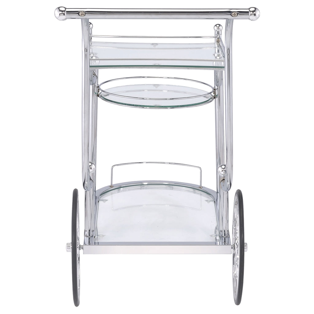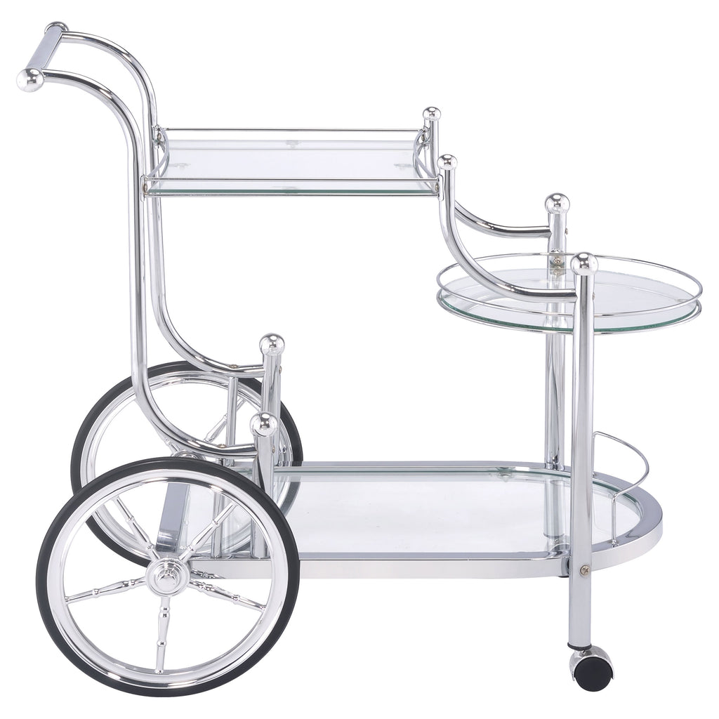 A fun traditional theme offers delightful charm that works perfectly in a traditional or transitional space. This serving cart mimics old fashioned style as it aids in delivering food and spirits to eager guests. Enjoy the captivating look of rustic wheels. Graceful curves create a compelling fluid silhouette on a cart made from metal with finishes in distressed white and chrome. Two tempered glass shelves hold beverages and implements. Key Features: • Carriage style serving cart dazzles with timeless appeal • Chrome finish further enhances classy feel • Three (3) tiers of clear tempered glass shelving with guardrails provide strength and style • Spoke wheels and casters add antique-style detail • Steel and glass construction