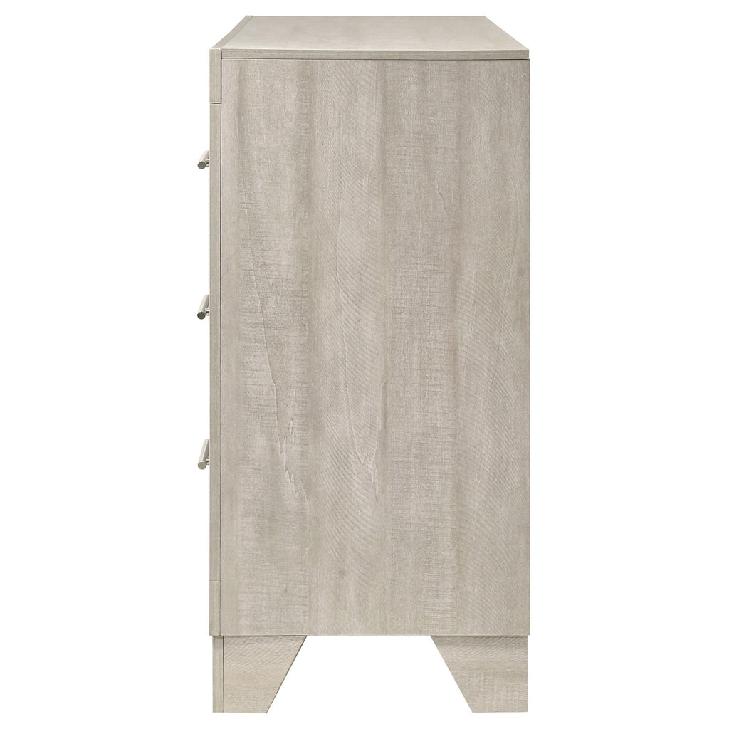 This six-drawer dresser combines modern style with a rustic edge, creating the perfect balance of elegance and functionality for your bedroom. With a rustic cream finish over rough-sawn, white-washed engineered paper veneer, it exudes a warm yet contemporary feel. The extra-wide polished nickel handles add a sleek contrast, enhancing its sophisticated look. Constructed from durable engineered wood, the dresser features English dovetail joinery and Center metal glides, ensuring smooth operation and lasting quality. Its spacious drawers offer ample storage to keep your space organized and stylish. Key Features: • Rustic cream finish with rough-sawn, white-washed engineered paper veneer • Six spacious drawers with English dovetail joinery for durability • Extra-wide polished nickel handles for a sleek, modern touch • Smooth Center metal drawer glides for easy access • Crafted from engineered wood for stability and style • Perfect blend of rustic charm and contemporary design